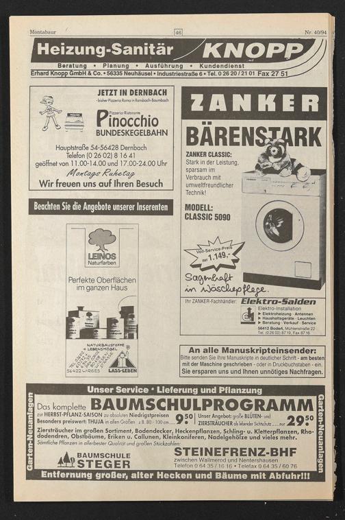 ter im aroßen Sortiment, Bodendecker, Heckenpflanzen, Schling- u. Kletterpflanzen, Rho- i, Obstb äume, Eriken u. Callunen, Kleinkoniferen, Nadelgehöfze und vieles mehr.