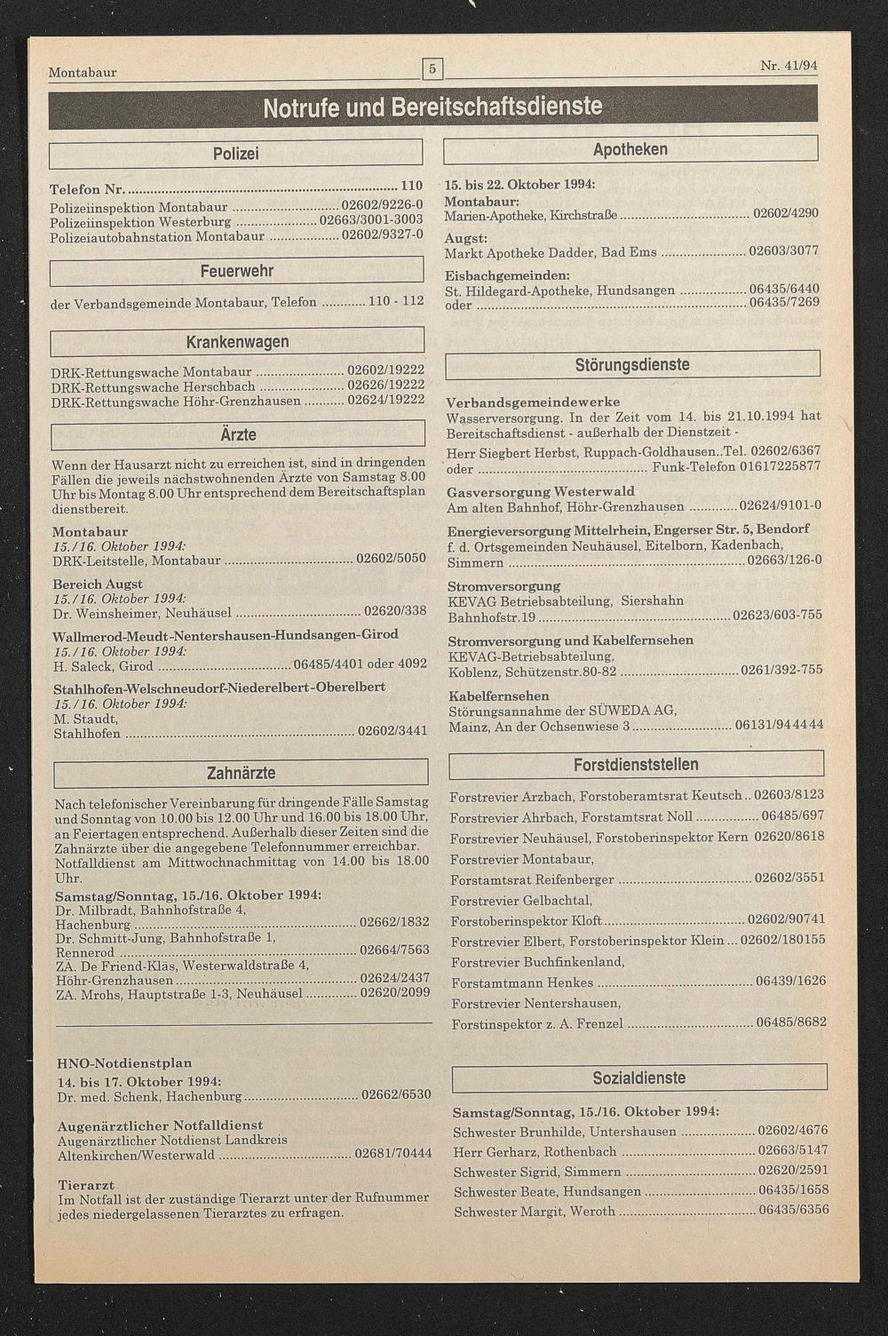 HNO-Notdienstplan 14. bis 17. Oktober 1994: