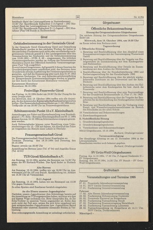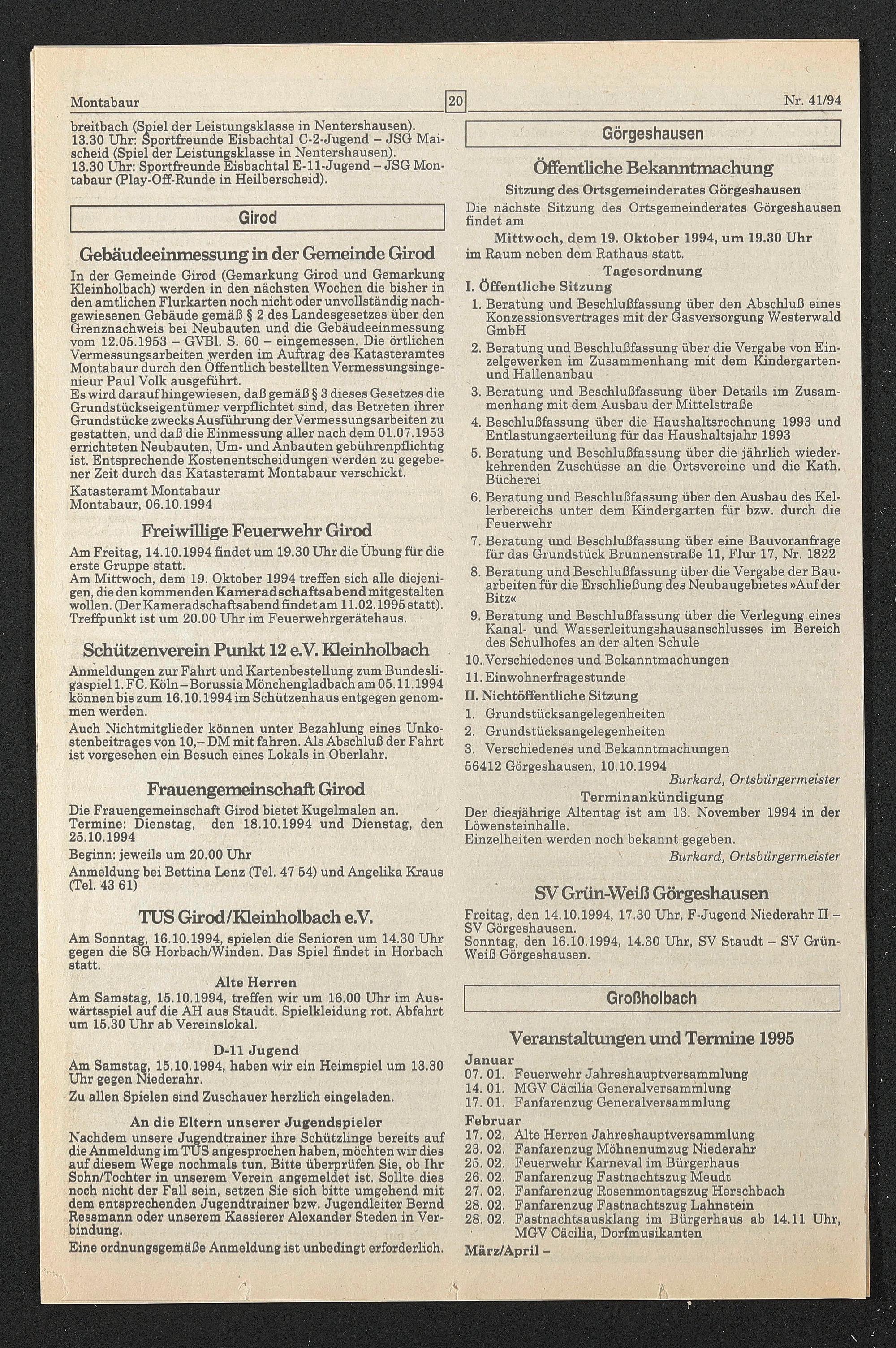 3. Verschiedenes und Bekanntmachungen 56412 Görgeshausen, 10.10.1994