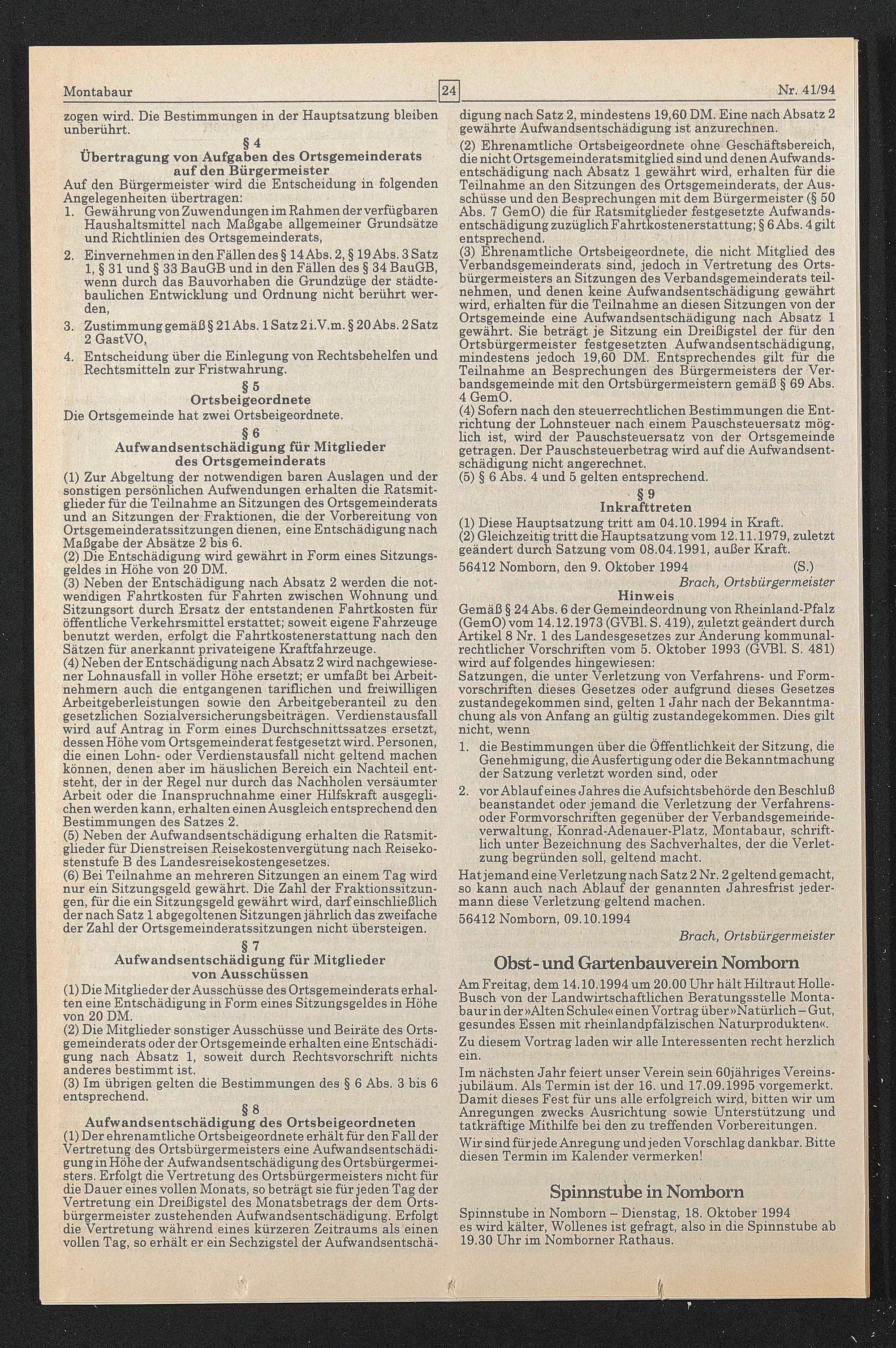 Gemäß § 24 Abs. 6 der Gemeindeordnung von Rheinland-Pfalz (GemO) vom 14.12.1973 (GVB1. S. 419), zuletzt geändert durch Artikel 8 Nr. 1 des Landesgesetzes zur Änderung kommunalrechtlicher Vorschriften vom 5. Oktober 1993 (GVB1. S. 481) wird auf folgendes hingewiesen: