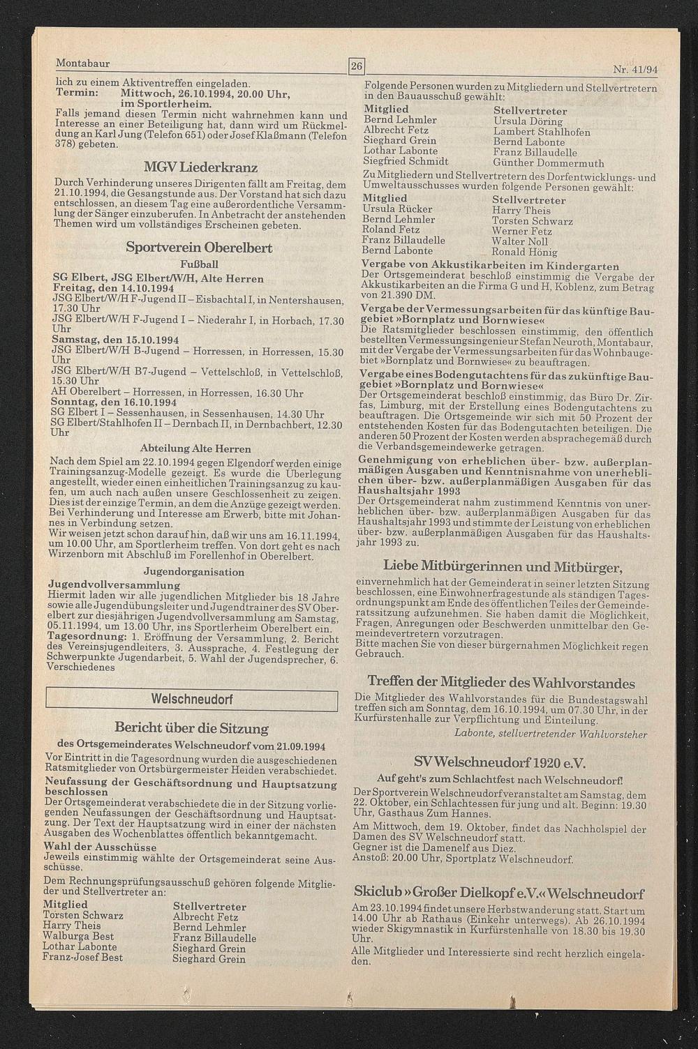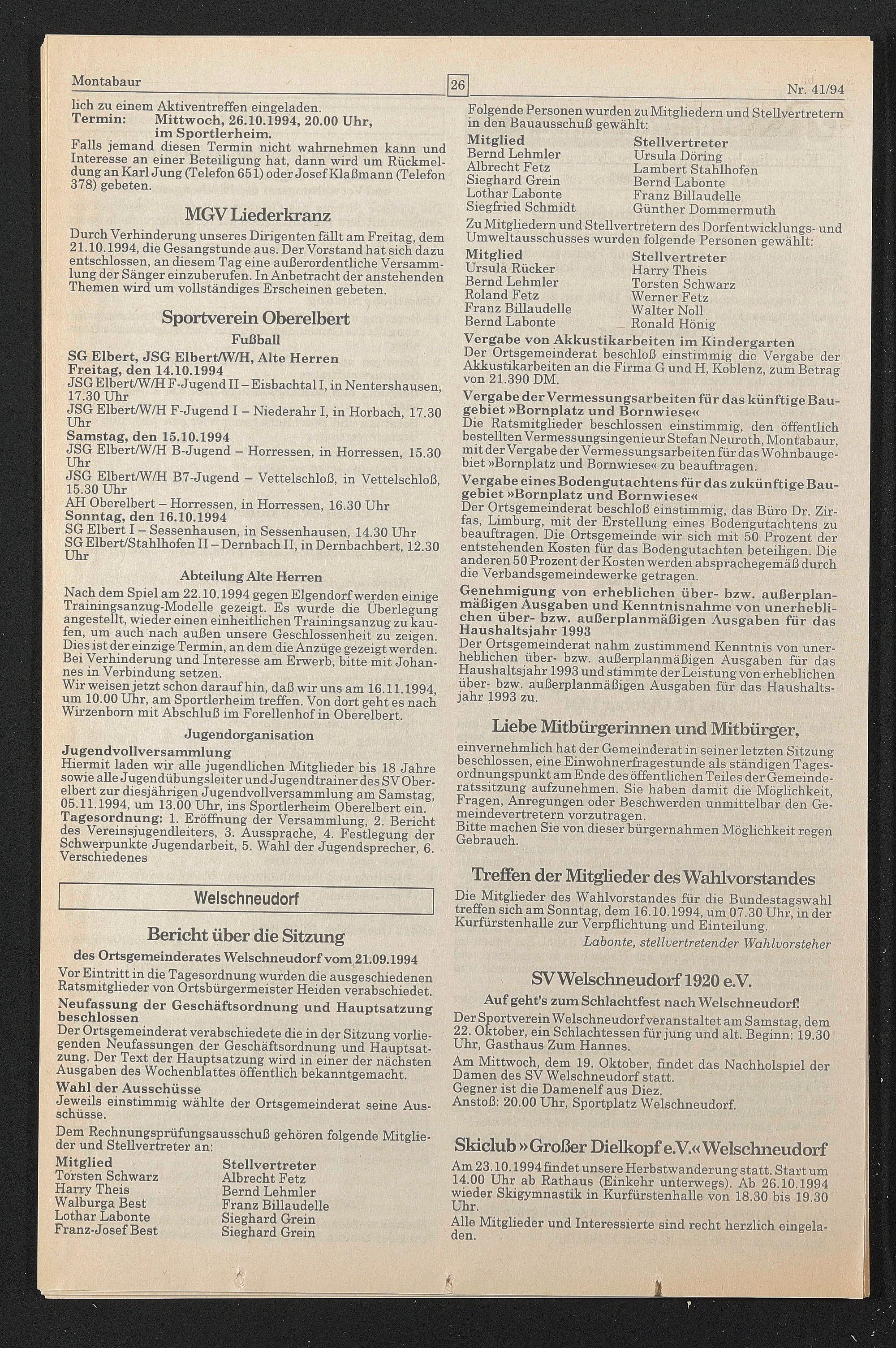 des Ortsgemeinderates Welschneudorf vom.21.09.1994 Vor Eintritt in die Tagesordnung wurden die ausgeschiedenen Ratsmitglieder von Ortsbürgermeister Heiden verabschiedet.