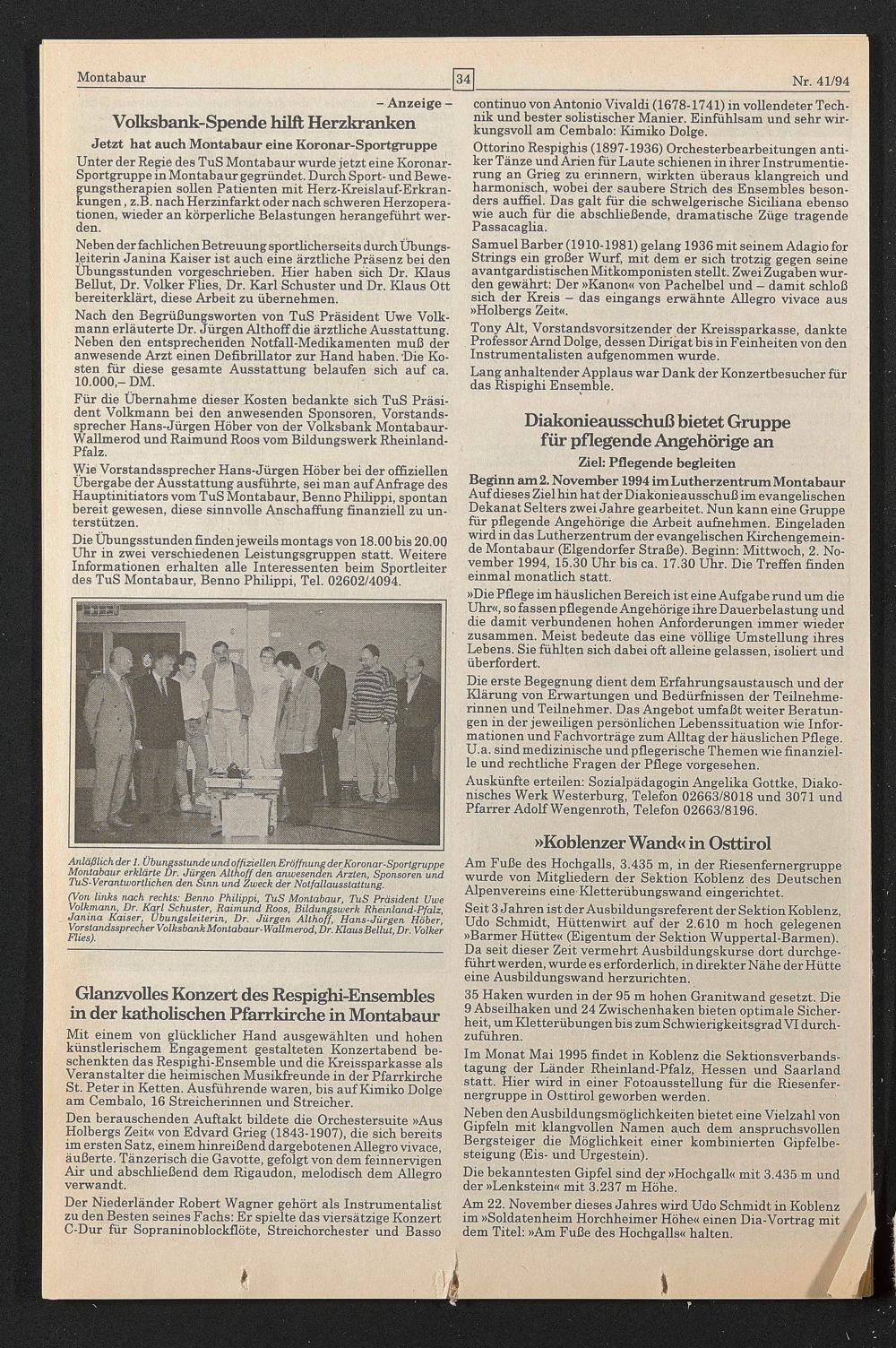 Unter der Regie des TuS Montabaur wurde jetzt eine Koronar- Sportgruppe in Montabarur gegründet. Durch Sport- und Bewegungstherapien sollen Patienten mit Herz-Kreislauf-Erkrankungen , z.B. nach Herzinfarkt oder nach schweren Herzoperationen, wieder an körperliche Belastungen herangeführt werden.