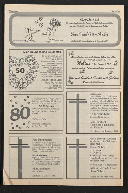 die uns anläßlich unserer goldenen Hochzeit, mit so vielen Glückwünschen, Blumen und Geschenken erfreuten, sagen wir auf diesem Wege unseren herzlichen Dank. Besonderen Dank unserem Jahrgang, Herrrn Pfarrer Linnighäuser und Bürgermeister Willi Bode