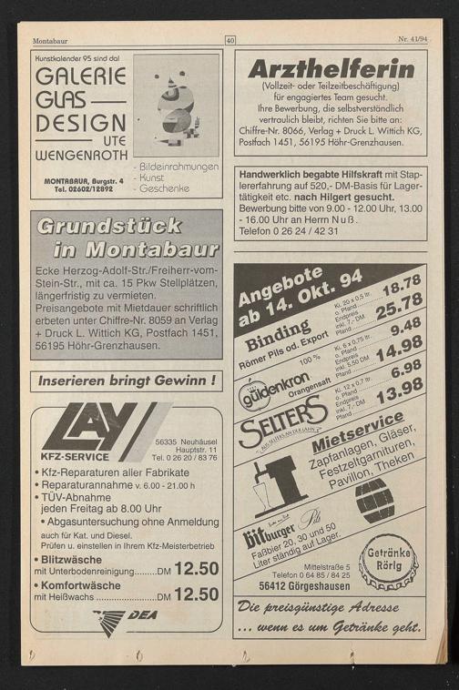 Ihre Bewerbung, die selbstverständlich vertraulich bleibt, richten Sie bitte an: Chiffre-Nr. 8066, Verlag + Druck L. Wittich KG, Postfach 1451,56195 Höhr-Grenzhausen.