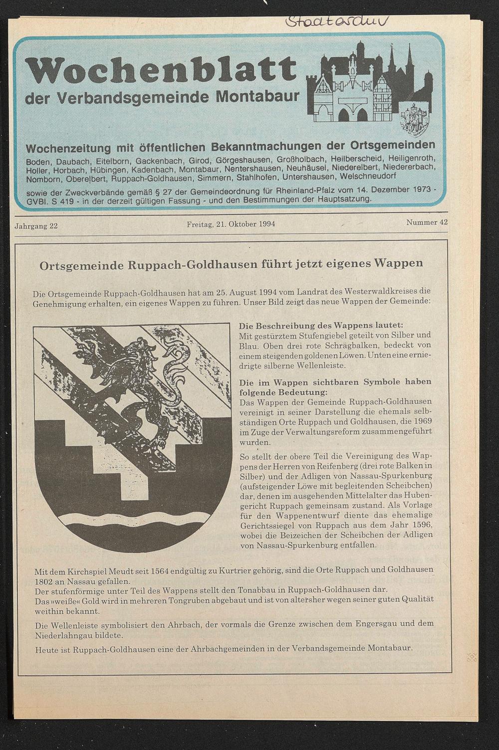 Die Ortsgemeinde Ruppach-Goldhausen hat am 25. August 1994 vom Landrat des Westerwaldkreises die Genehmigung erhalten, ein eigenes Wappen zu führen. Unser Bild zeigt das neue Wappen der Gemeinde: