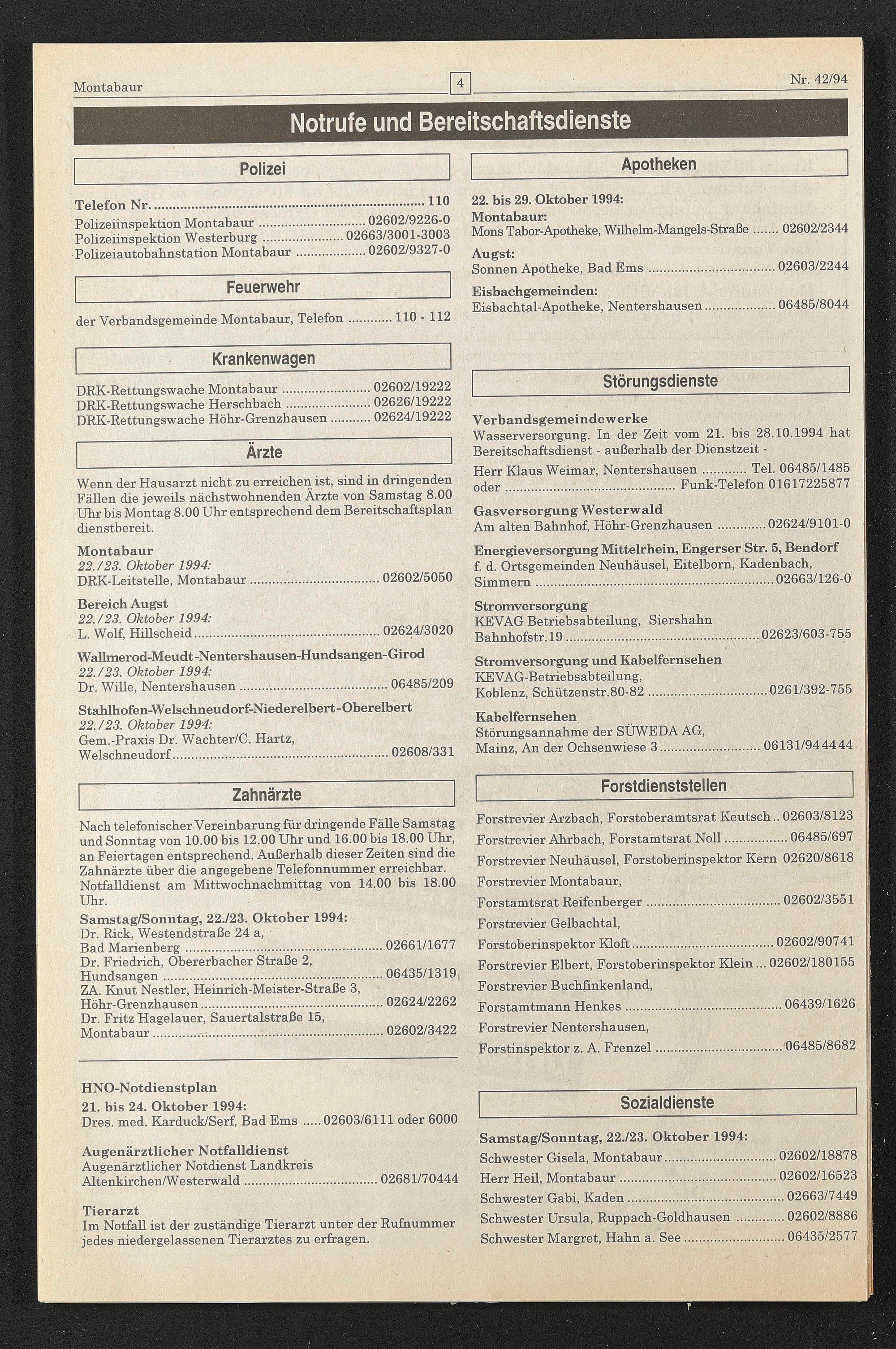 HNO-Notdienstplan 21. bis 24. Oktober 1994: