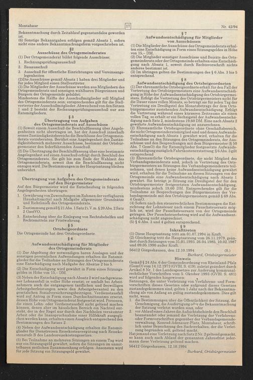 Gemäß § 24 Abs. 6 der Gemeindeordnung von Rheinland-Pfalz (GemO) vom 14.12.1973 (GVB1. S. 419), zuletzt geändert durch Artikel 8 Nr. 1 des Landesgesetzes zur Änderung kommunalrechtlicher Vorschriften vom 5. Oktober 1993 (GVB1. S. 481) wird auf folgendes hingewiesen: ,