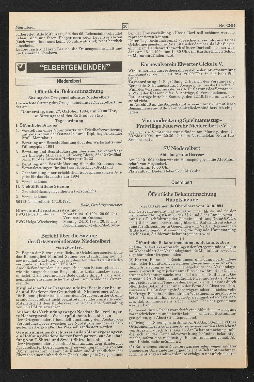 der Ortsgemeinde Oberelbert vom 13.10.1994
