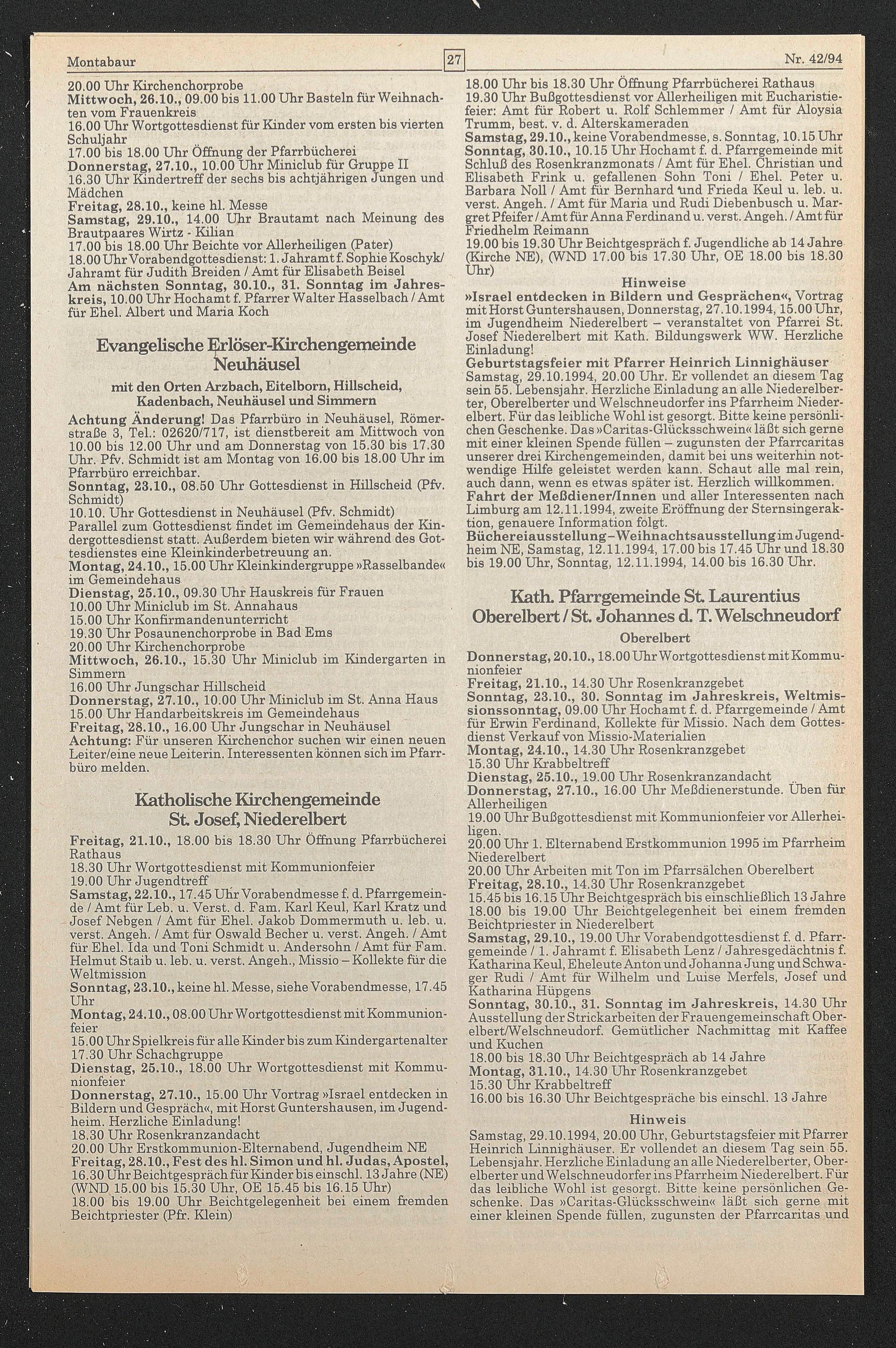 Samstag, 29.10.1994, 20.00 Uhr, Geburtstagsfeier mit Pfarrer Heinrich Linnighäuser. Er vollendet an diesem Tag sein 55. Lebensjahr. Herzliche Einladung an alle Niederelberter, Oberelberter und Welschneudorfer ins Pfarrheim Niederelbert. Für das leibliche Wohl ist gesorgt. Bitte keine persönlichen Geschenke. Das »Caritas-Glücksschwein« läßt sich gerne mit einer kleinen Spende füllen, zugunsten der Pfarrcaritas und