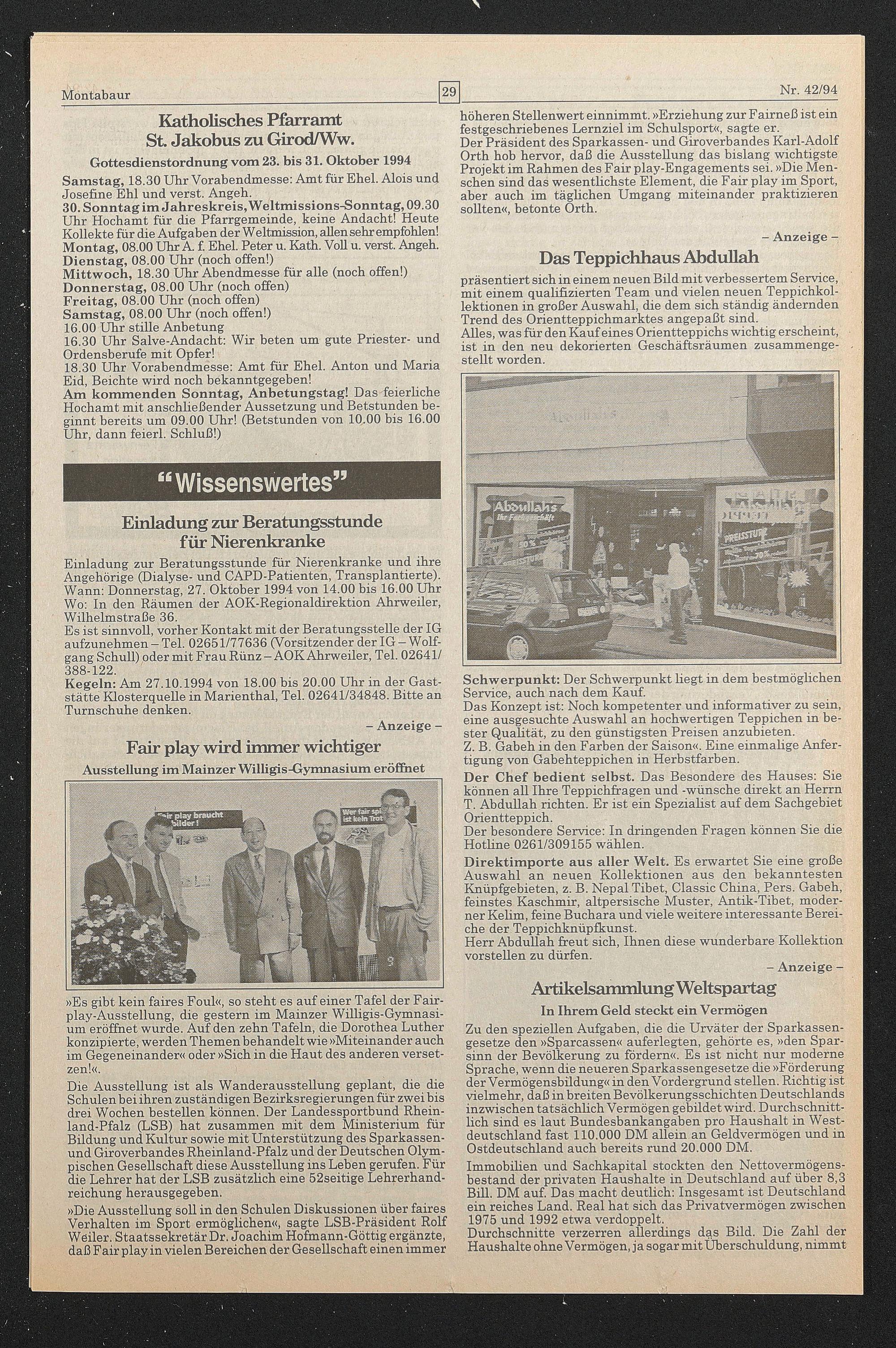 Kegeln: Am 27.10.1994 von 18.00 bis 20.00 Uhr in der Gaststätte Klosterquelle in Marienthal, Tel. 02641/34848. Bitte an Turnschuhe denken.