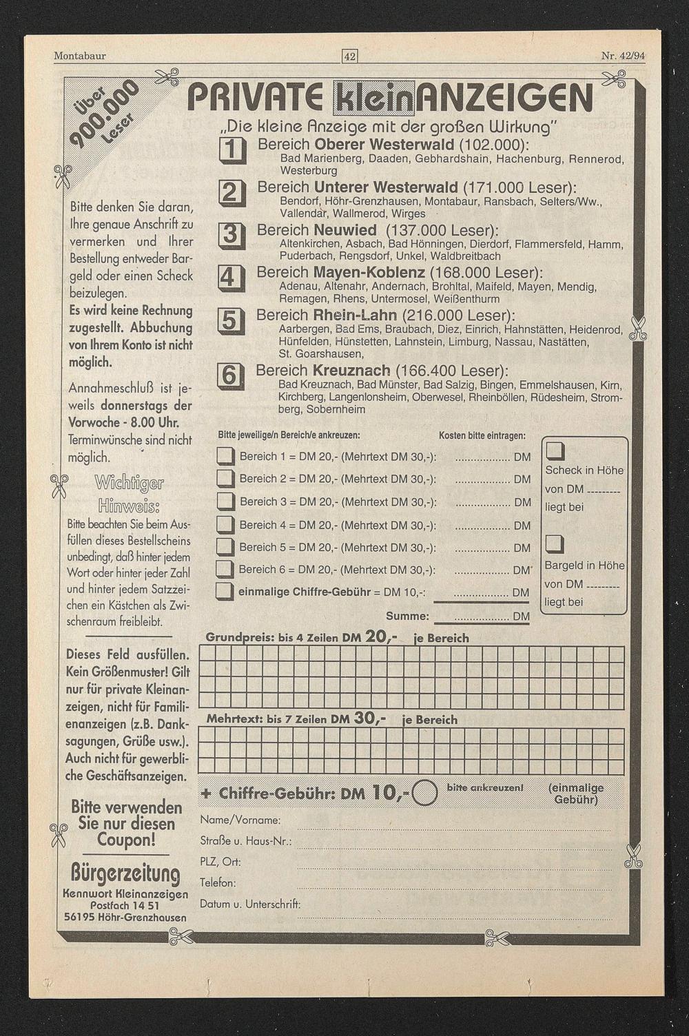 Kennwort Kleinanzeigen Postfach 14 51 56195 Höhr-Grenzhausen