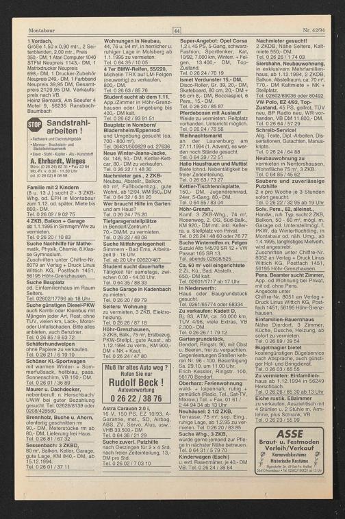 Siershahn, Neubauwohnung, in exklusivem Mehrfamilienhaus, ab 1.12.1994, 2 ZKDB, Balkon, Abstellraum, ca. 70 m 2 , 770,- DM Kaltmiete + NK + Stellplatz.