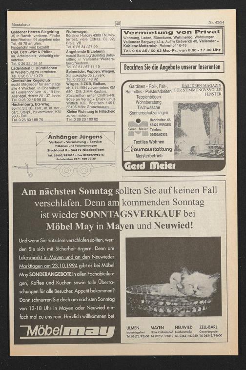 Markttagen am 23.10.1994 gibt es bei Möbel May SONDERANGEBOTE in allen Fachabteilungen, Kaffee und Kuchen sowie tolle Überraschungen für alle Besucher. Appetit bekommen? Dann schnurren Sie doch am nächsten Sonntag von 13-18 Uhr in Mayen oder Neuwied einfach mal zu uns rein. Herzlich willkommen bei