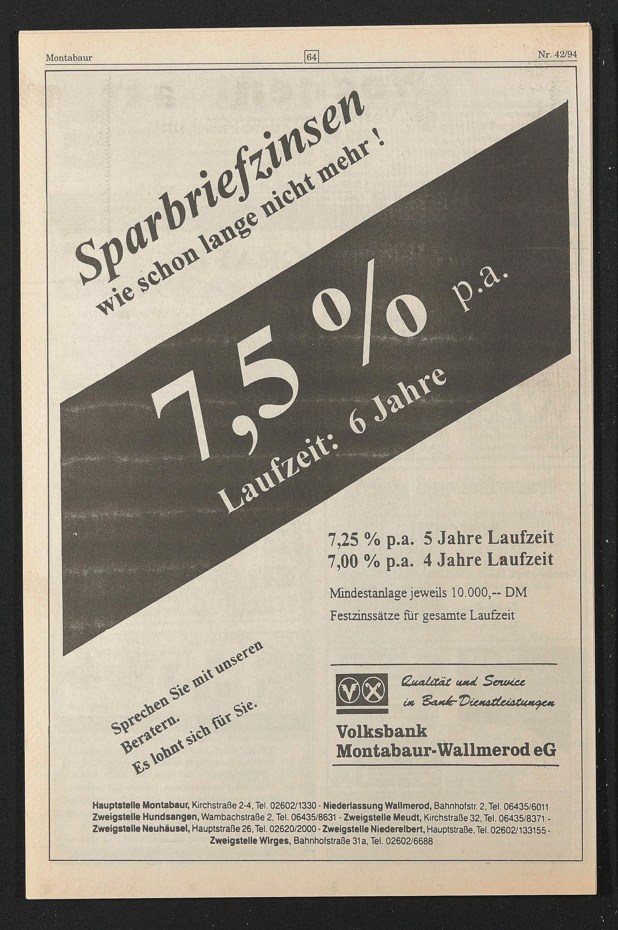 Hauptstelle Montabaur, Kirchstraße 2-4, Tel. 02602/1330 - Niederlassung Wallmerod, Bahnhofstr. 2, Tel. 06435/6011 Zweigstelle Hundsangen, Wambachstraße 2, Tel. 06435/8631 - Zweigstelle Meudt, Kirchstraße 32, Tel. 06435/8371 - Zweigstelle Neuhäusel, Hauptstraße 26, Tel. 02620/2000 - Zweigstelle Niederelbert, Hauptstraße,Tel. 02602/133155 -