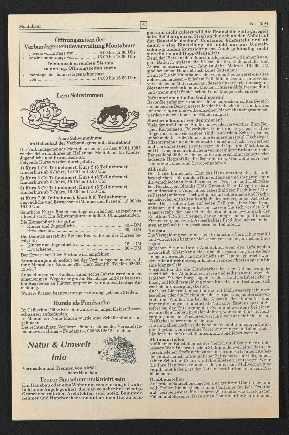 Die Verbandsgemeinde Montabaur bietet ab dem 09.01.1995 wieder Schwimmkurse im Hallenbad Montabaur für Kinder, Jugendliche und Erwachsene an.