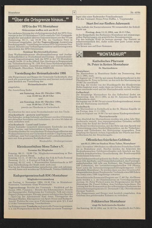 Die diesjährige Martinsfeier für das Gelbachtal findet am Donnerstag, dem 10.11.1994, in der St. Antonius-Kapelle in Bladernheim statt.