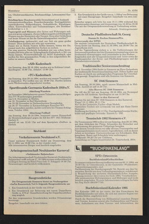 Nachbereitung der Bundestagswahl '94, Bericht aus den Gemeinden, Bericht aus dem Verbandsgemeinderat, redaktionelle Besprechung der nächsten »Stelzenbach-Ecbo« Ausgabe, Planung weiterer Aktivitäten bis Ende 1994, Verschiedenes. Alle interessierten Mitbürgerinnen und Mitbürger sind recht herzlich eingeladen. Weitere Informationen erfragen Sie bitte bei Jörg Harle (06439/7750).