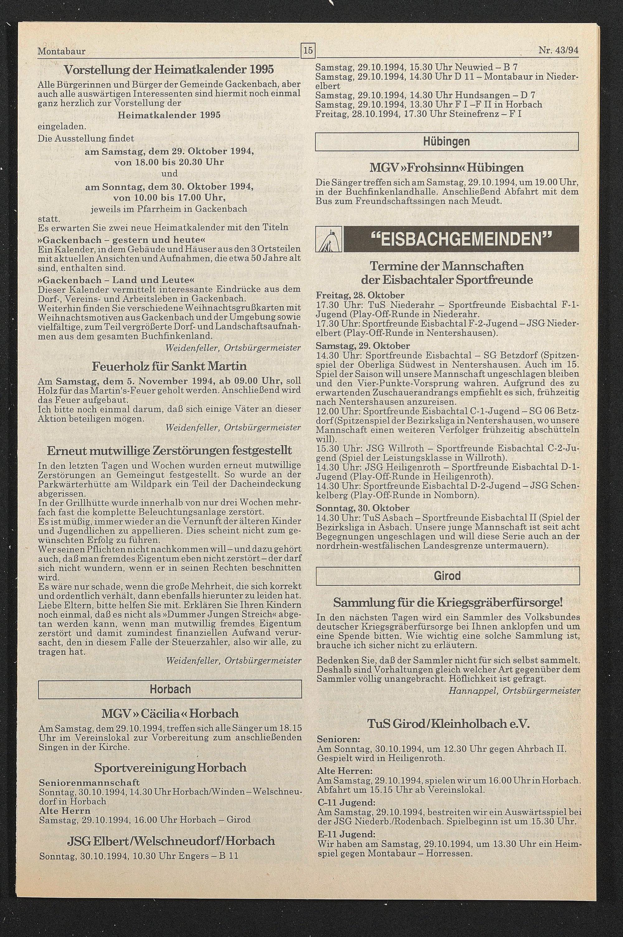 Samstag, 29.10.1994, 14.30 Uhr Hundsangen - D 7 Samstag, 29.10.1994, 13.30 Uhr FI -FII in Horbach Freitag, 28.10.1994, 17.30 Uhr Steinefrenz — FI