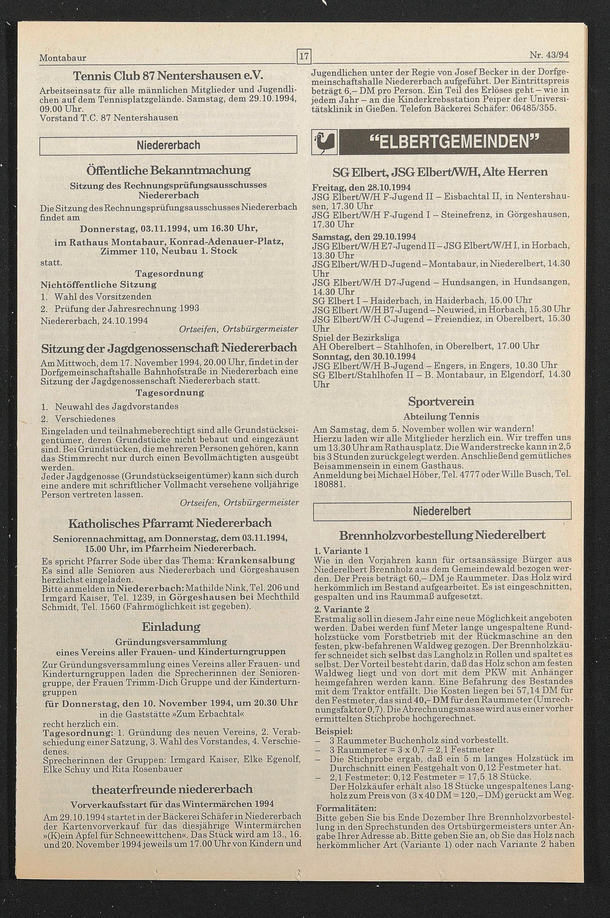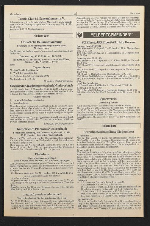 Am Mittwoch, dem 17. November 1994,20.00 Uhr, findetin der Dorfgemeinschaftshalle Bahnhofstraße in Niedererbach eine Sitzung der Jagdgenossenschaft Niedererbach statt.
