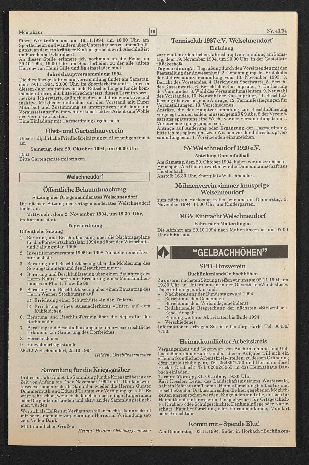 9. Einwohnerfragestunde 56412 Welschneudorf, 25.10.1994