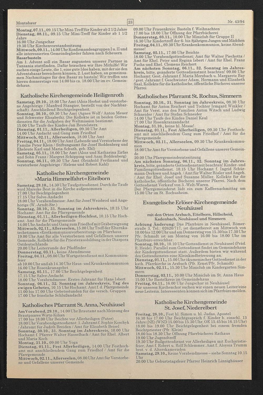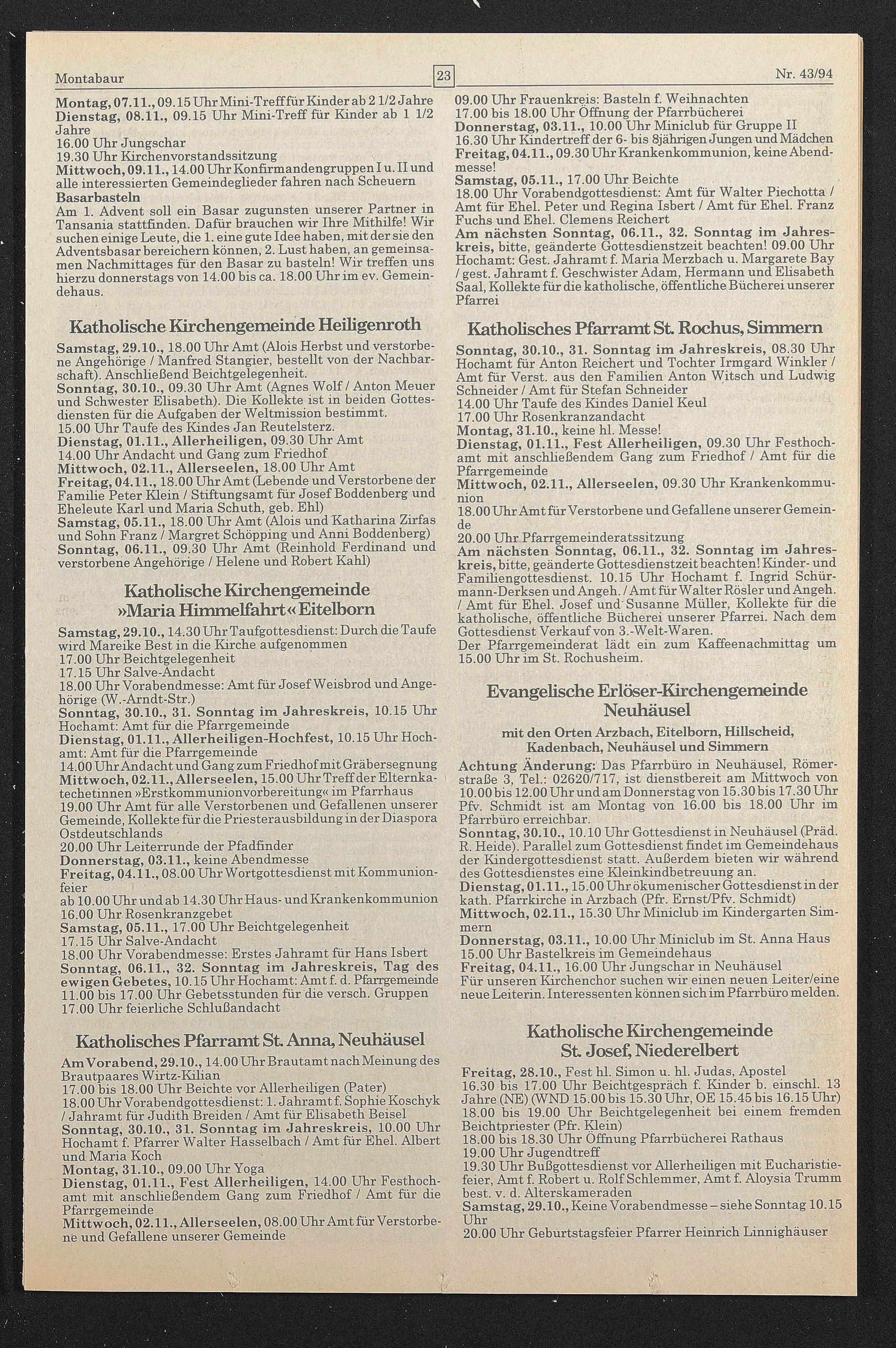 Achtung Änderung:’ Das Pfarrbüro in Neuhäusel, Römerstraße 3, Tel.: 02620/717, ist dienstbereit am Mittwoch von 10.00 bis 12.00UhrundamDonnerstagvon 15.30bis 17.30 Uhr Pfv. Schmidt ist am Montag von 16.00 bis 18.00 Uhr im Pfarrbüro erreichbar.