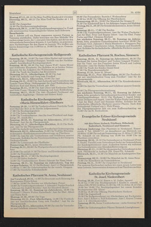 Donnerstag, 03.11., 10.00 Uhr Miniclub im St. Anna Haus 15.00 Uhr Bastelkreis im Gemeindehaus Freitag, 04.11., 16.00 Uhr Jungschar in Neuhäusel Für unseren Kirchenchor suchen wir einen neuen Leiter/eine neue Leiterin. Interessenten können sich im Pfarrbüro melden.
