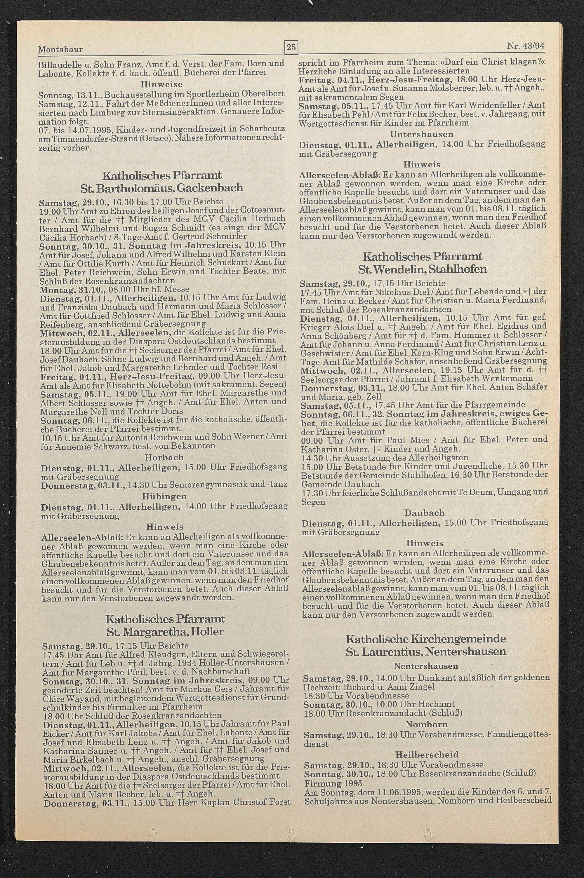 Samstag, 29.10., 18.30 Uhr Vorabendmesse Sonntag, 30.10., 18.00 Uhr Rosenkranzandacht (Schluß) Firmung 1995