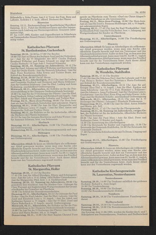 17.45 Uhr Amt für Alfred Kleudgen, Eltern und Schwiegereltern / Amt für Leb u. ff d. Jahrg. 1934 Holler-Untershausen / Amt für Margarethe Pfeil, best. v. d. Nachbarschaft Sonntag, 30.10., 31. Sonntag im Jahreskreis, 09.00 Uhr geänderte Zeit beachten! Amt für Markus Geis / Jahramt für Cläre Wayand, mit begleitendem Wortgottesdienst für Grundschulkinder bis Firmalter im Pfarrheim 18.00 Uhr Schluß der Rosenkranzandachten Dienstag, 01.11., Allerheiligen, 10.15 Uhr Jahramt für Paul Eicker / Amt für Karl Jakobs / Amt für Ehel. Labonte / Amt für Josef und Elisabeth Lenz u. ff Angeh. / Amt für Jakob und Katharina Sanner u. ft Angeh. / Amt für ff Ehel. Josef und Maria Birkelbach u. ft Angeh., anschl. Gräbersegnung Mittwoch, 02.11., Allerseelen, die Kollekte ist für die Priesterausbildung in der Diaspora Ostdeutschlands bestimmt 18.00 Uhr Amt für die ff Seelsorger der Pfarrei / Amt für Ehel. Anton und Maria Becher, leb. u. ff Angeh.