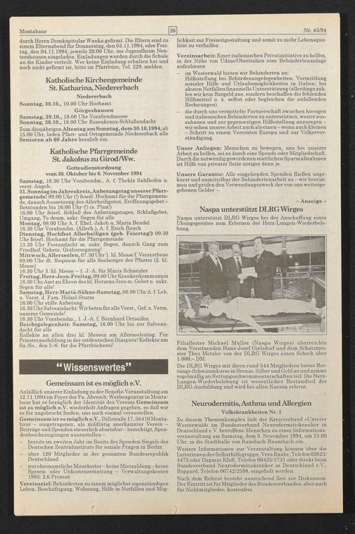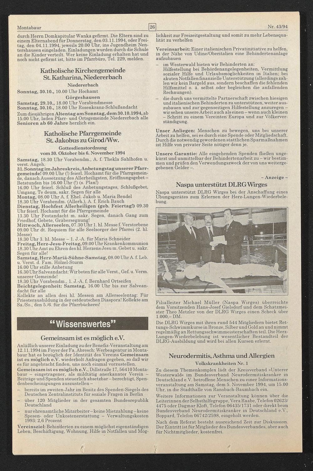 Anläßlich unserer Einladung zu der Benefiz-Veranstaltung am 12.11.1994 im Foyer der Fa. Abresch: Werbeagentur in Montabaur hat es bezüglich der Identität des Vereins Gemeinsam ist es möglich e.V. wiederholt Anfragen gegeben, so daß wir es für angebracht finden, uns noch einmal vorzustellen. Gemeinsam ist es möglich e.V., Dillstraße 17,56410 Montabaur — eingetragener, als mildtätig anerkannter Verein — Beiträge und Spenden steuerlich absetzbar—berechtigt, Spendenbescheinigungen auszustellen —