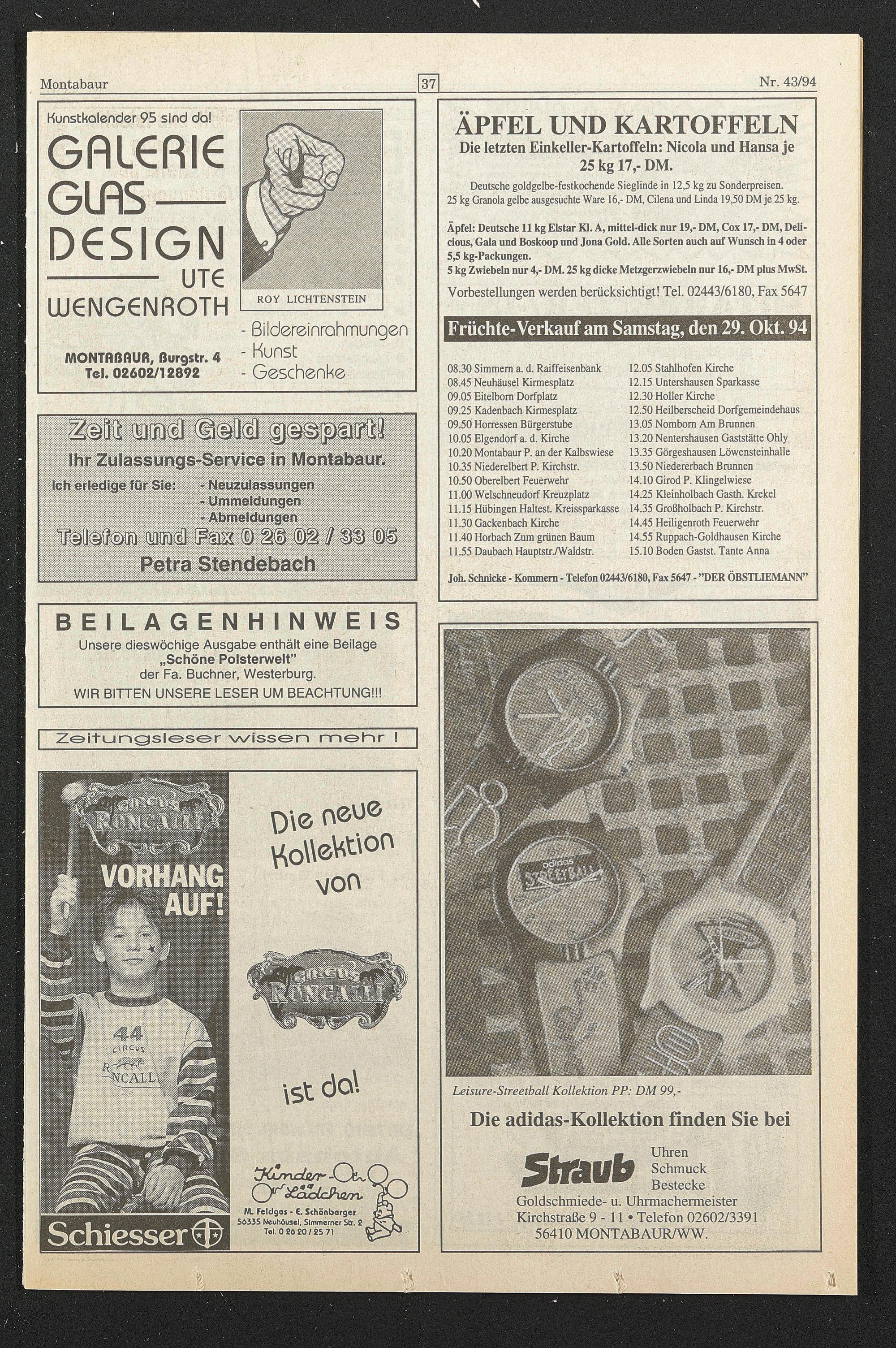 Äpfel: Deutsche 11 kg Eistar Kl. A, mittel-dick nur 19,- DM, Cox 17,- DM, Deli- cious, Gala und Boskoop und Jona Gold. Alle Sorten auch auf Wunsch in 4 oder 5,5 kg-Packungen.