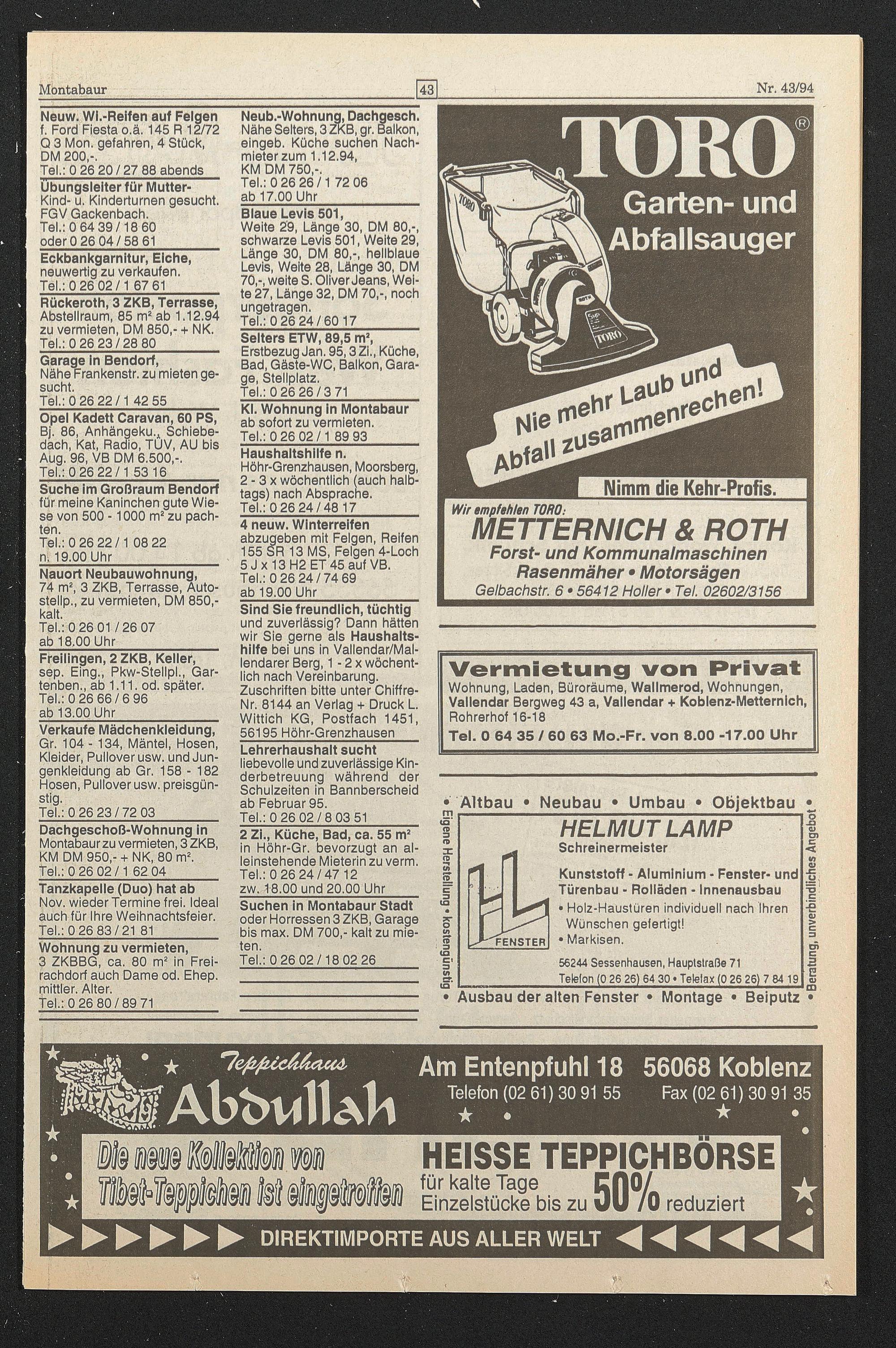 Rückeroth, 3 ZKB, Terrasse, Abstellraum, 85 m 2 ab 1.12.94 zu vermieten, DM 850,- + NK. Tel.: 0 26 23/28 80_