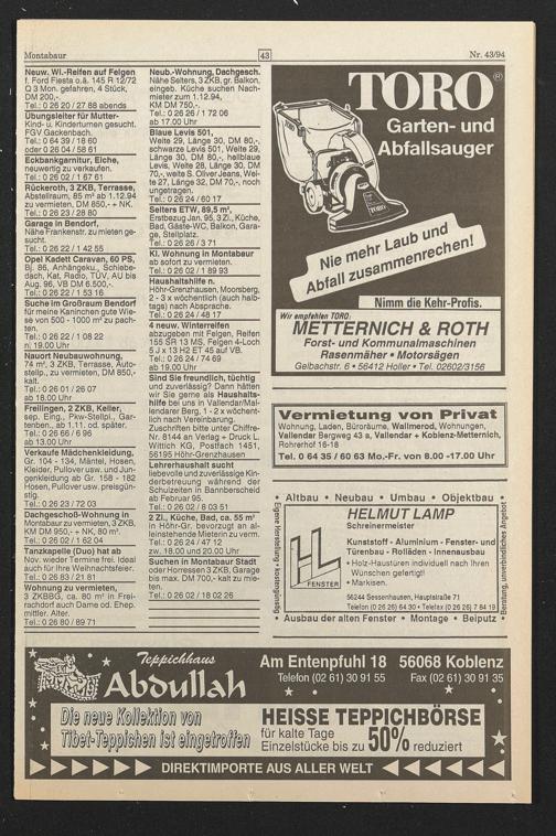 Sind Sie freundlich, tüchtig und zuverlässig? Dann hätten wir Sie gerne als Haushaltshilfe bei uns in Vallendar/Mal- lendarer Berg, 1 - 2 x wöchentlich nach Vereinbarung. Zuschriften bitte unter Chiffre- Nr. 8144 an Verlag + Druck L. Wittich KG, Postfach 1451, 56195 Höhr-Grenzhausen Lehrerhaushalt sucht liebevolle und zuverlässige Kinderbetreuung während der Schulzeiten in Bannberscheid ab Februar 95.