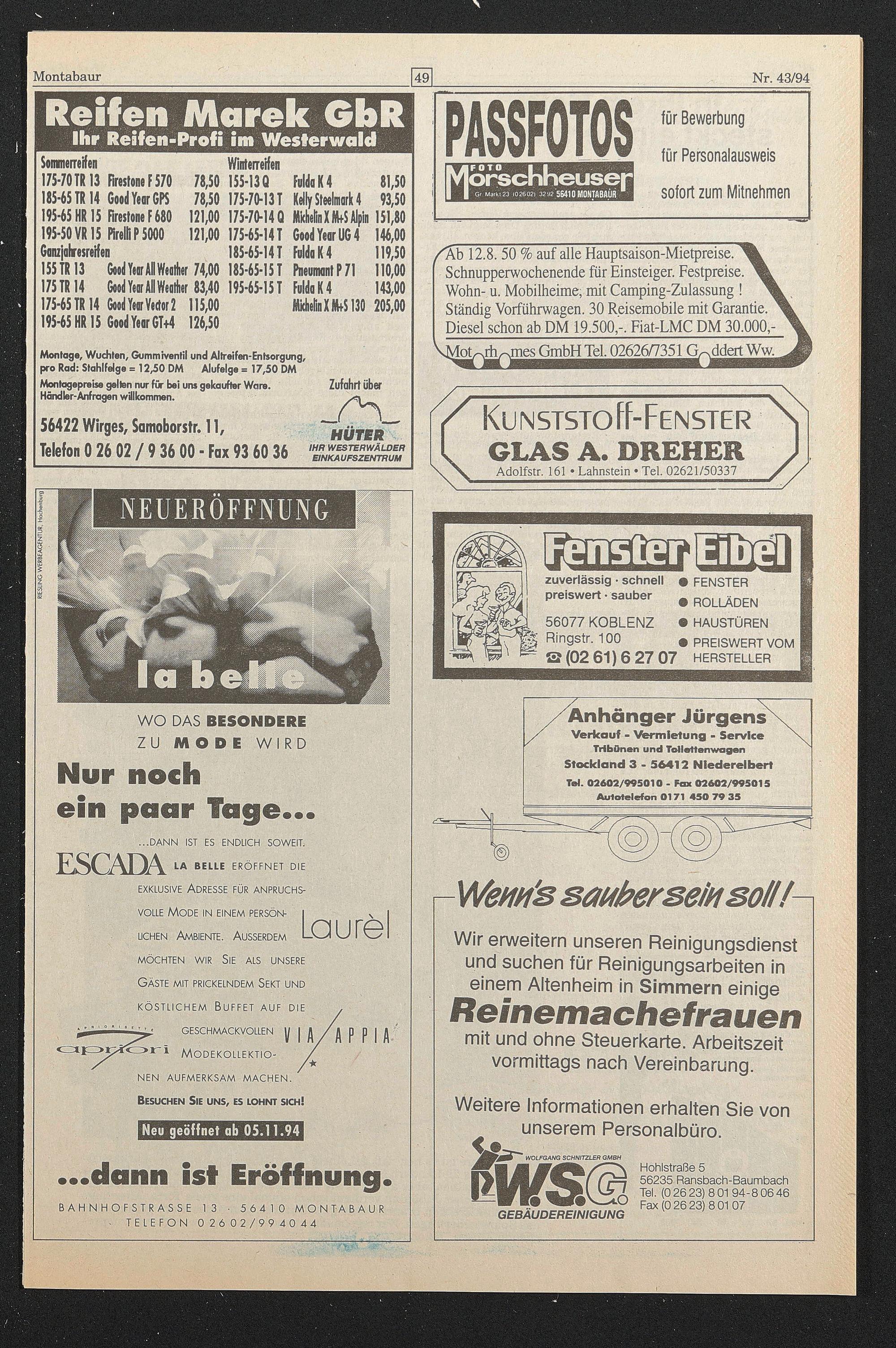 Montage, Wuchten, Gummiventil und Allreifen-Entsorgung, pro Rad: Stahlfelge = 12,50 DM Alufelge = 17,50 DM Montagepreise gellen nur für bei uns gekaufter Ware. Händler-Anfragen willkommen.