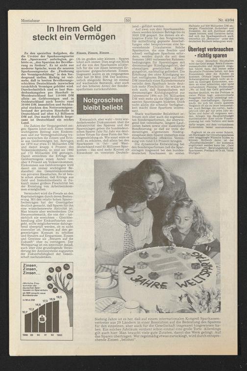 Ob im großen oder kleinen - Sparen lohnt sich immer. Dies zeigt ein Blick auf die von den Sparkassen alljährlich für die von ihnen betreuten Ersparnisse gutgeschriebenen Zinsen. Insgesamt waren es im vergangenen Jahr fast 20 Mrd. DM. Der kontinuierlich steigende Betrag ist einmal auf wachsende Bestände, aber auch auf den höheren Anteil der Sondersparformen zurückzuführen.