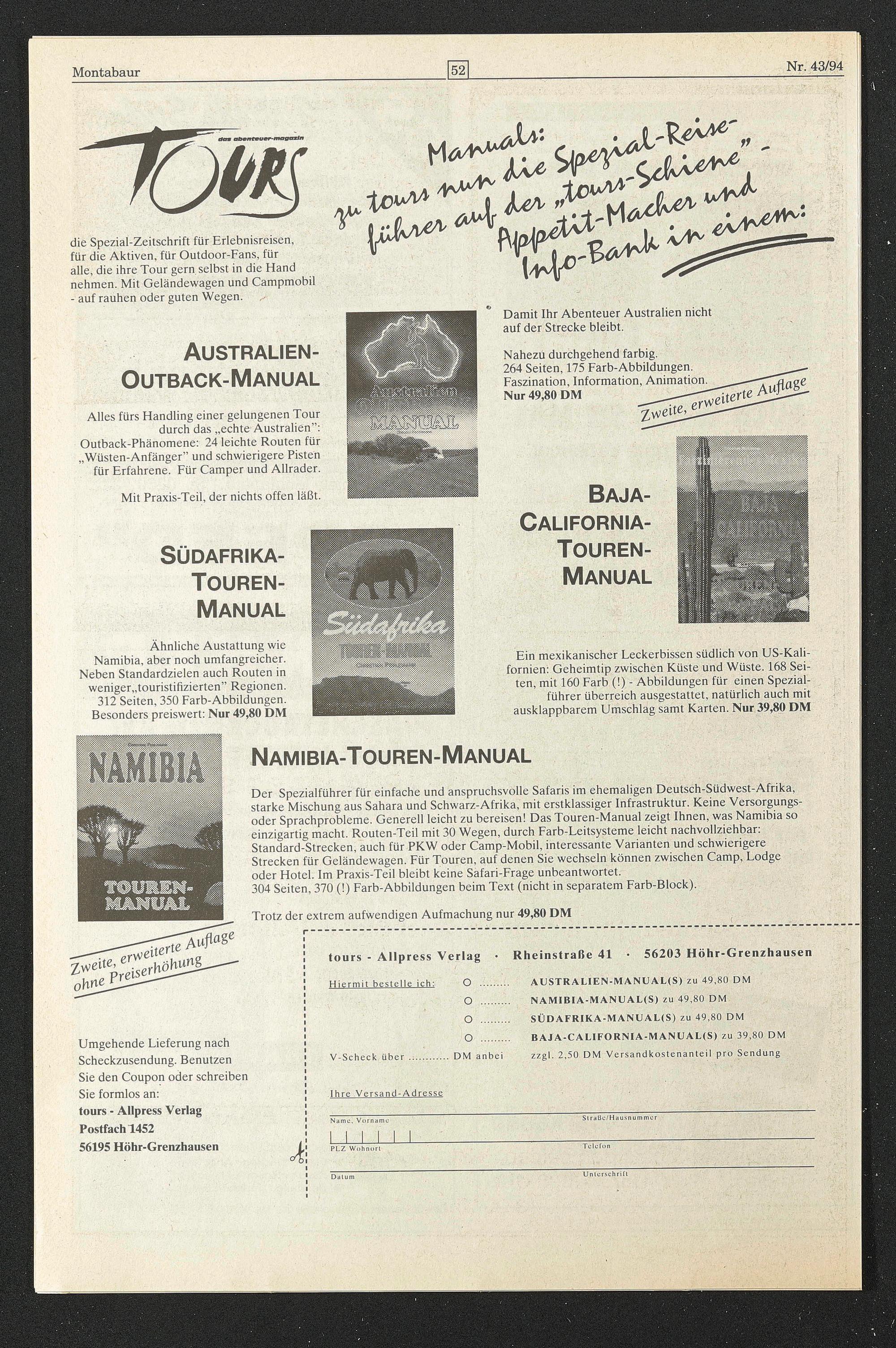 AUSTRALIEN-MANUAL(S) zu 49,80 DM NAMIBIA-MANUAL(S) zu 49,80 DM SÜDAFRIKA-MANUAL(S) zu 49,80 DM BAJA-CALIFORNIA-MANUAL(S) zu 39,80 DM zzgl. 2,50 DM Versandkostenanteil pro Sendung