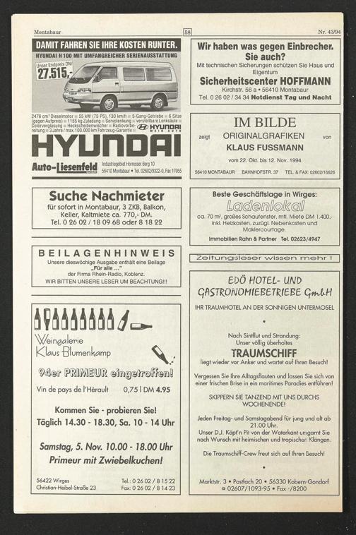 vom 22. Okt. bis 12. Nov. 1994 56410 MONTABAUR BAHNHOFSTR. 37 TEL. & FAX: 02602/16626