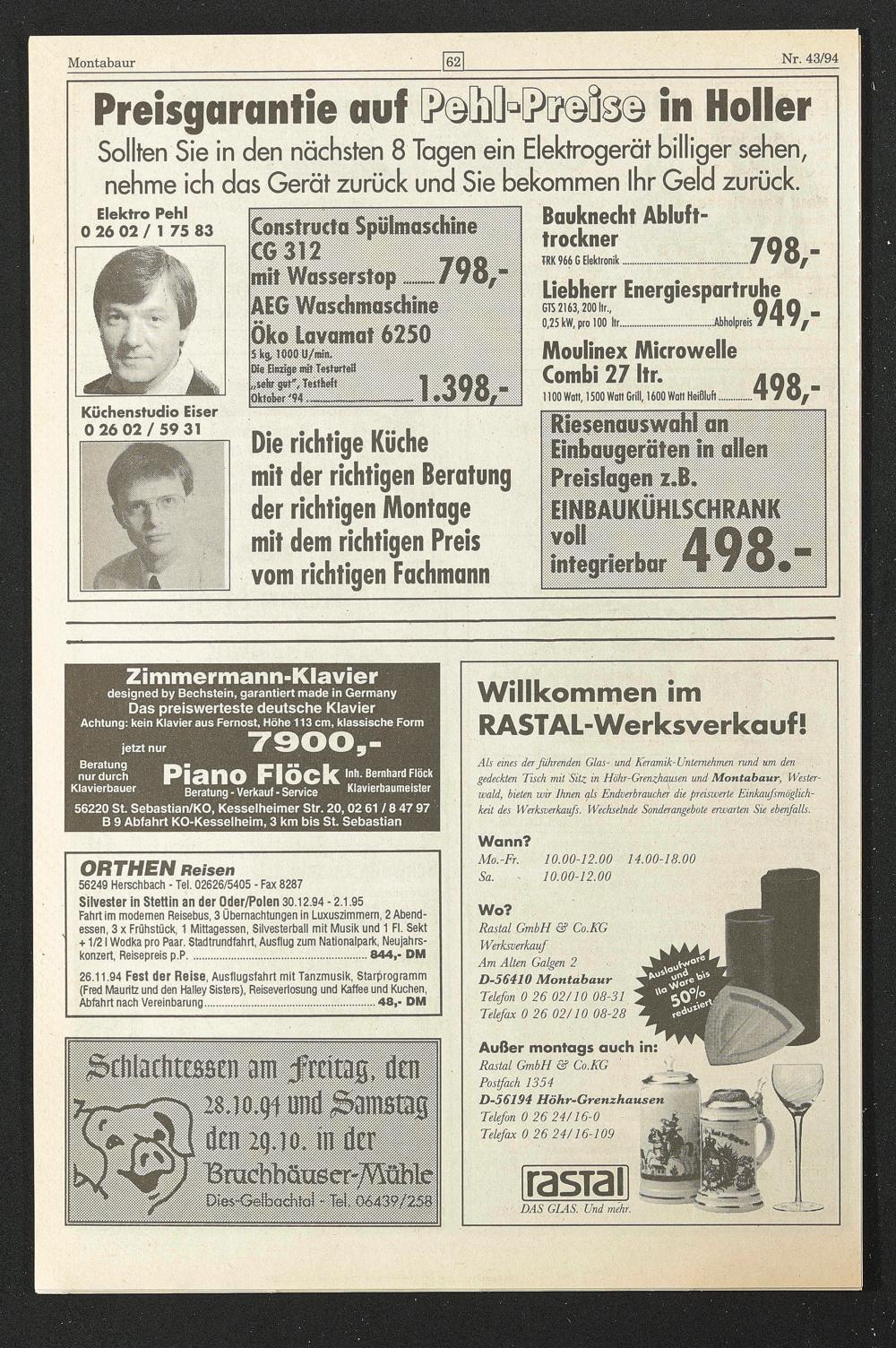 56249 Herschbach - Tel. 02626/5405 - Fax 8287 Silvester in Stettin an der Oder/Polen 30.12.94 - 2.1.95 Fahrtim modernen Reisebus, 3 Übernachtungen in Luxuszimmem, 2 Abendessen, 3 x Frühstück, 1 Mittagessen, Silvesterball mit Musik und 1 Fl. Sekt +1/21 Wodka pro Paar. Stadtrundfahrt, Ausflug zum Nationalpark, Neujahrskonzert, Reisepreis p.P. 844,- DM
