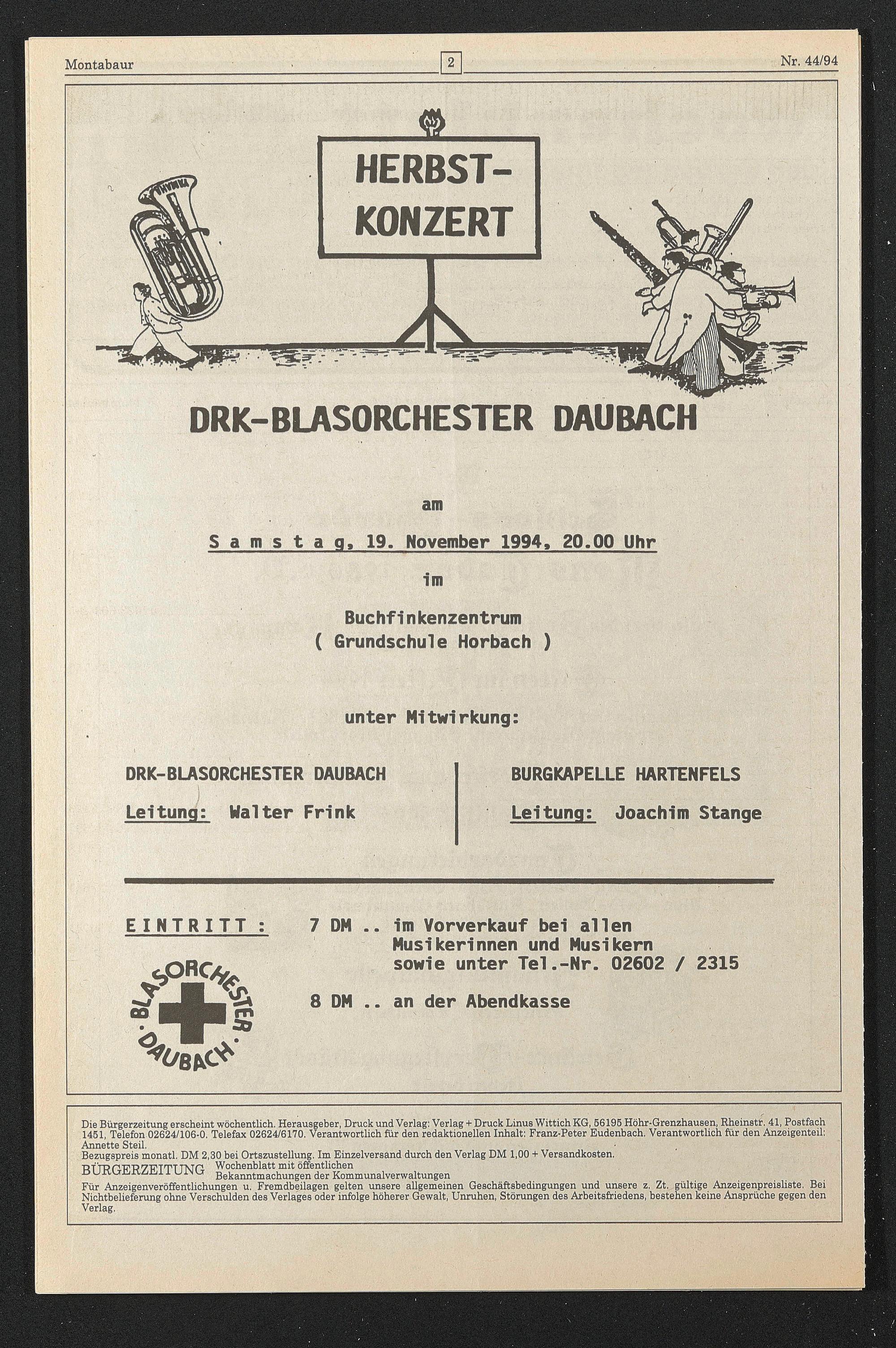Die Bürgerzeitung erscheint wöchentlich. Herausgeber, Druck und Verlag: Verlag + Druck Linus Wittich KG, 56195 Höhr-Grenzhausen, Rheinstr. 41, Postfach 1451, Telefon 02624/106-0. Telefax 02624/6170. Verantwortlich für den redaktionellen Inhalt: Franz-Peter Eudenbach. Verantwortlich für den Anzeigenteil: Annette Steil.