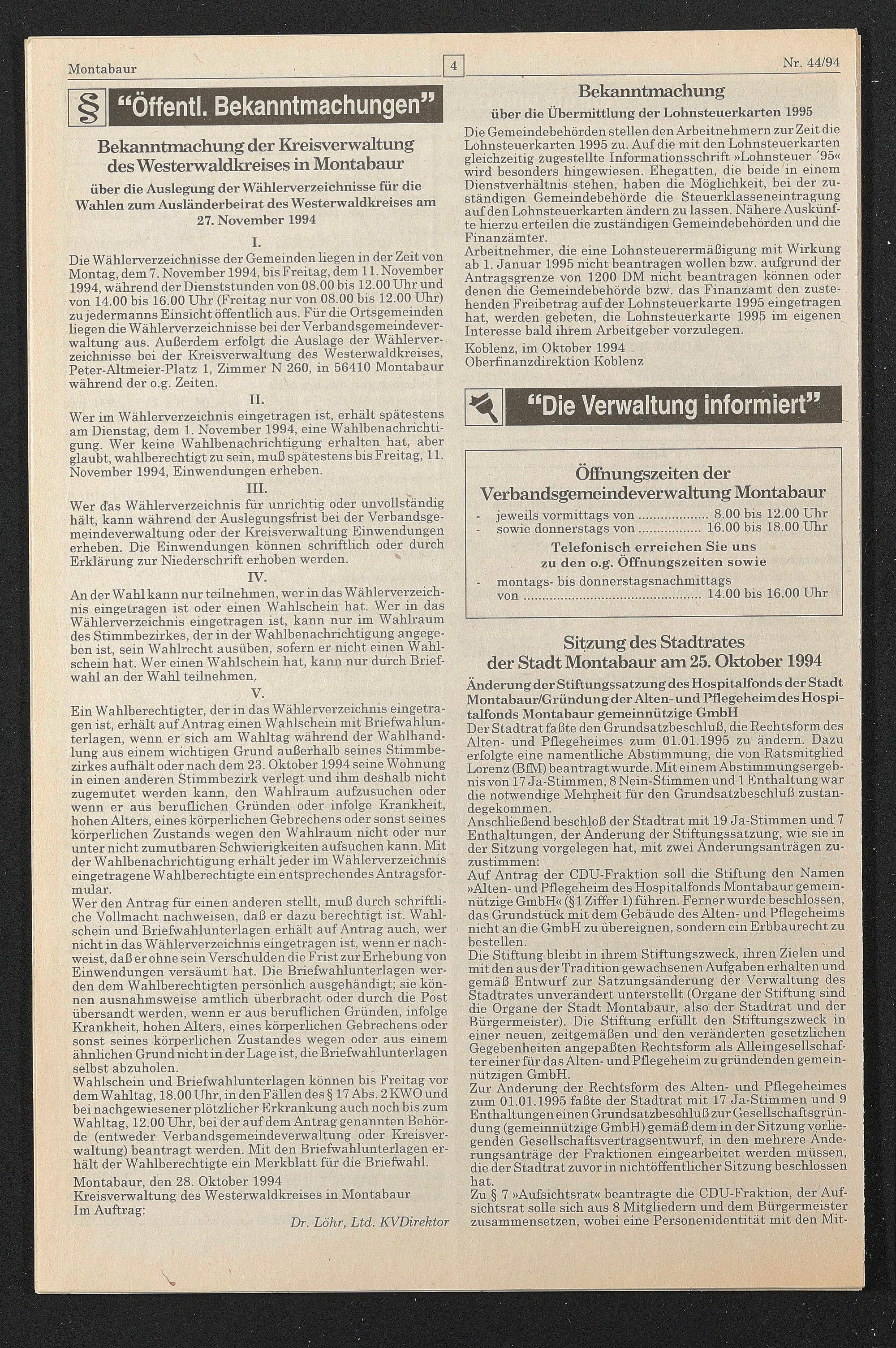 Die Wählerverzeichnisse der Gemeinden liegen in der Zeit von Montag, dem 7. November 1994, bis Freitag, dem 11. November 1994, während der Dienststunden von 08.00 bis 12.00 Uhr und von 14.00 bis 16.00 Uhr (Freitag nur von 08.00 bis 12.00 Uhr) zu jedermanns Einsicht öffentlich aus. Für die Ortsgemeinden Hegen die Wählerverzeichnisse bei der Verbandsgemeindeverwaltung aus. Außerdem erfolgt die Auslage der Wählerverzeichnisse bei der Kreisverwaltung des Westerwaldkreises, Peter-Altmeier-Platz 1, Zimmer N 260, in 56410 Montabaur während der o.g. Zeiten.