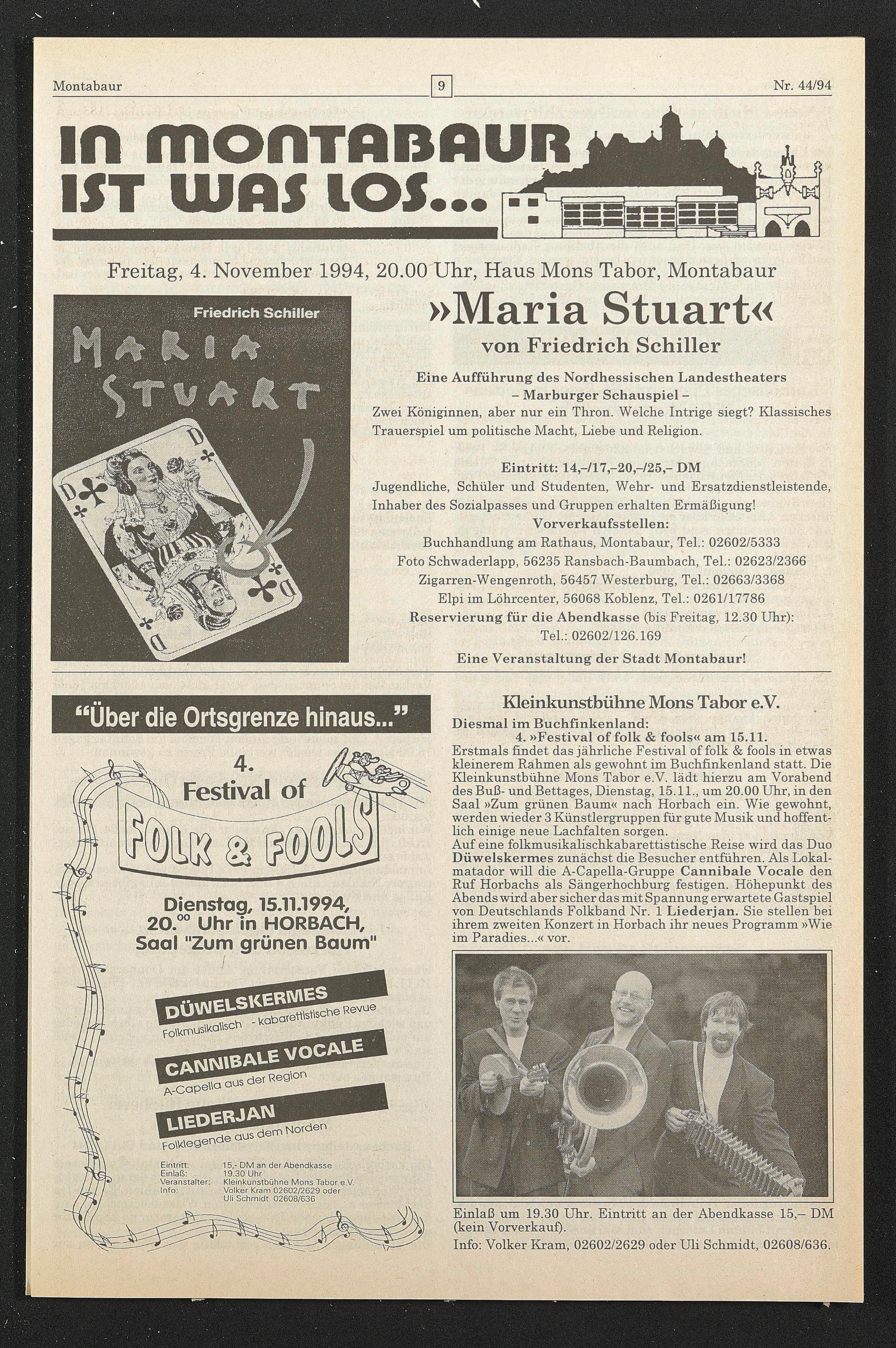 Buchhandlung am Rathaus, Montabaur, Tel.: 02602/5333 Foto Schwaderlapp, 56235 Ransbach-Baumbach, Tel.: 02623/2366 Zigarren-Wengenroth, 56457 Westerburg, Tel.: 02663/3368 Elpi im Löhrcenter, 56068 Koblenz, Tel.: 0261/17786 Reservierung für die Abendkasse (bis Freitag, 12.30 Uhr):