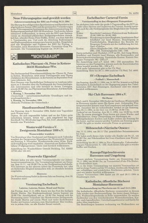 Unsere nächste Versammlung findet am Donnerstag, dem 10.11.1994, um 20.00 Uhr, im Vereinslokal »Fohr-Pils Stube«, in Niederelbert statt.