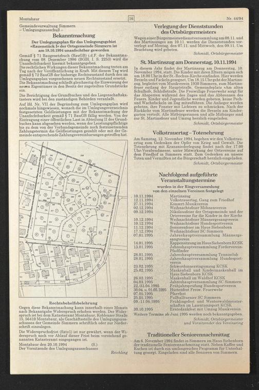 In diesem Jahr findet der Martinszug am Donnerstag, 10. November 1994, statt. Die Kinder mit ihren Eltern mögen sich um 18.00 Uhr in der St.-Rochus-Kirche einfinden. Hier werden Brezeln und Fackeln gesegnet. Um 18.15 Uhr geht der Martinszug, begleitet vom Musikverein 1930 Simmern, zum Martinsfeuer entlang der Hauptstraße, Gemeindeplatz »Am alten Schulhof«, Schloßstraße. Die Freiwillige Feuerwehr sorgt für das Absperren während des Zuges und das Abbrennen des Feuers. Kinder und Jugendliche werden gebeten, keine Pech- und Wachsfackeln im Zug mitzuführen. Die Anlieger werden gebeten, ihre Fenster mit Lichtern zu schmücken. Nach der Rückkehr vom Martinsfeuer werden die Brezeln am Kindergarten verteilt. Alle Mitbürgerinnen und alle Mitbürger sind zur St. Martinsfeier und Umzug herzlich eingeladen.