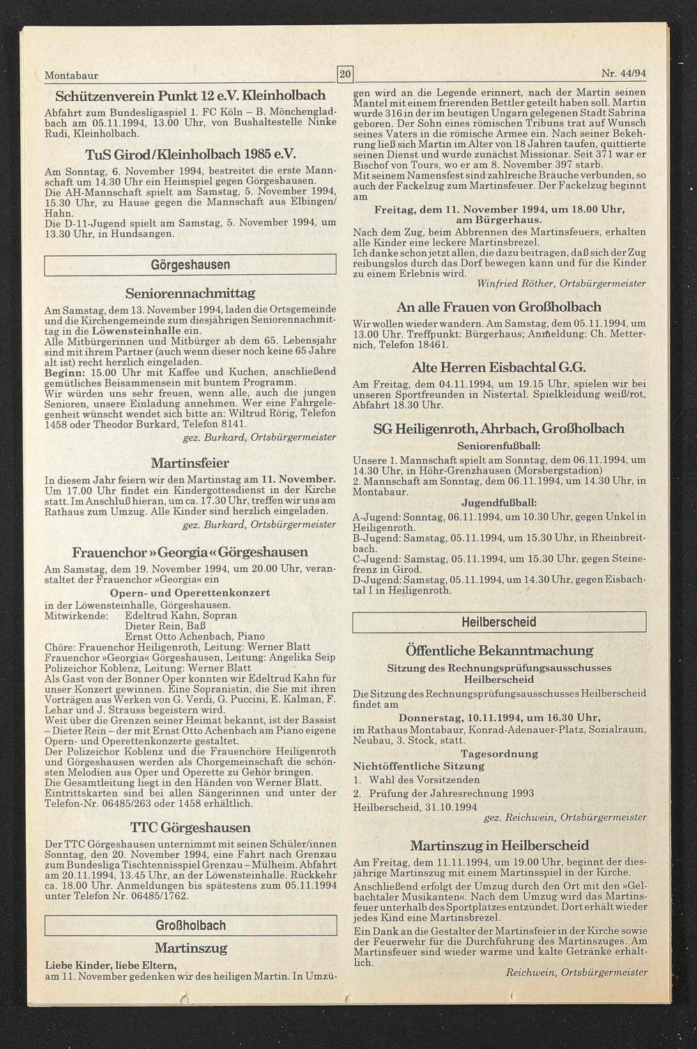Donnerstag, 10.11.1994, um 16.30 Uhr, im Rathaus Montabaur, Konrad-Adenauer-Platz, Sozialraum, Neubau, 3. Stock, statt.