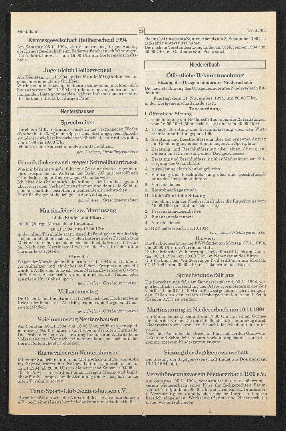 Die Sprechstunde fallt am Donnerstagabend, 03.11.1994, wegen beruflicher Fortbildung des Ortsbürgermeisters in der Zeit vom 02.11, bis 04.11.1994 aus. Es wird gebeten, sich in dringenden Fällen an den ersten Ortsbeigeordneten Arnold Frink (Telefon 8197) zu wenden.
