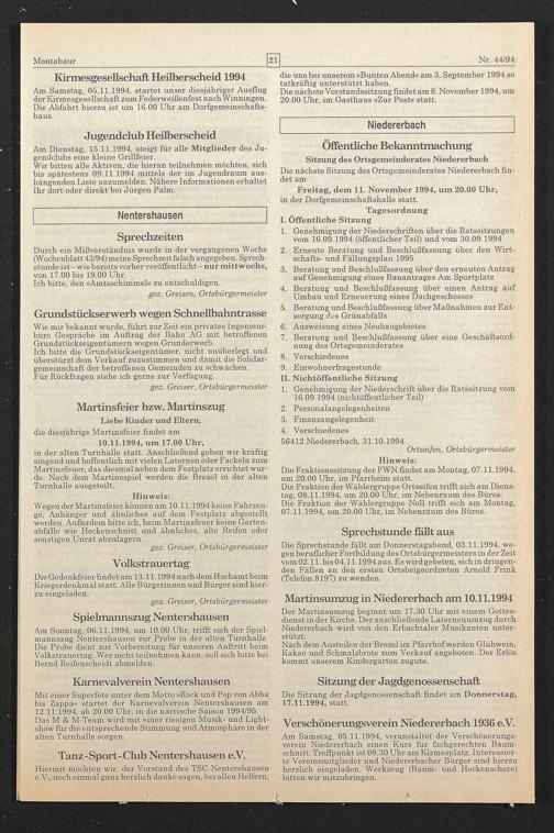 Wegen der Martinsfeier können am 10.11.1994 keine Fahrzeuge, Anhänger und ähnliches auf dem Festplatz abgestellt werden. Außerdem bitte ich, beim Martinsfeuer keine Gartenabfälle wie Heckenschnitt und ähnliches, alte Reifen oder sonstigen Unrat abzulagern.
