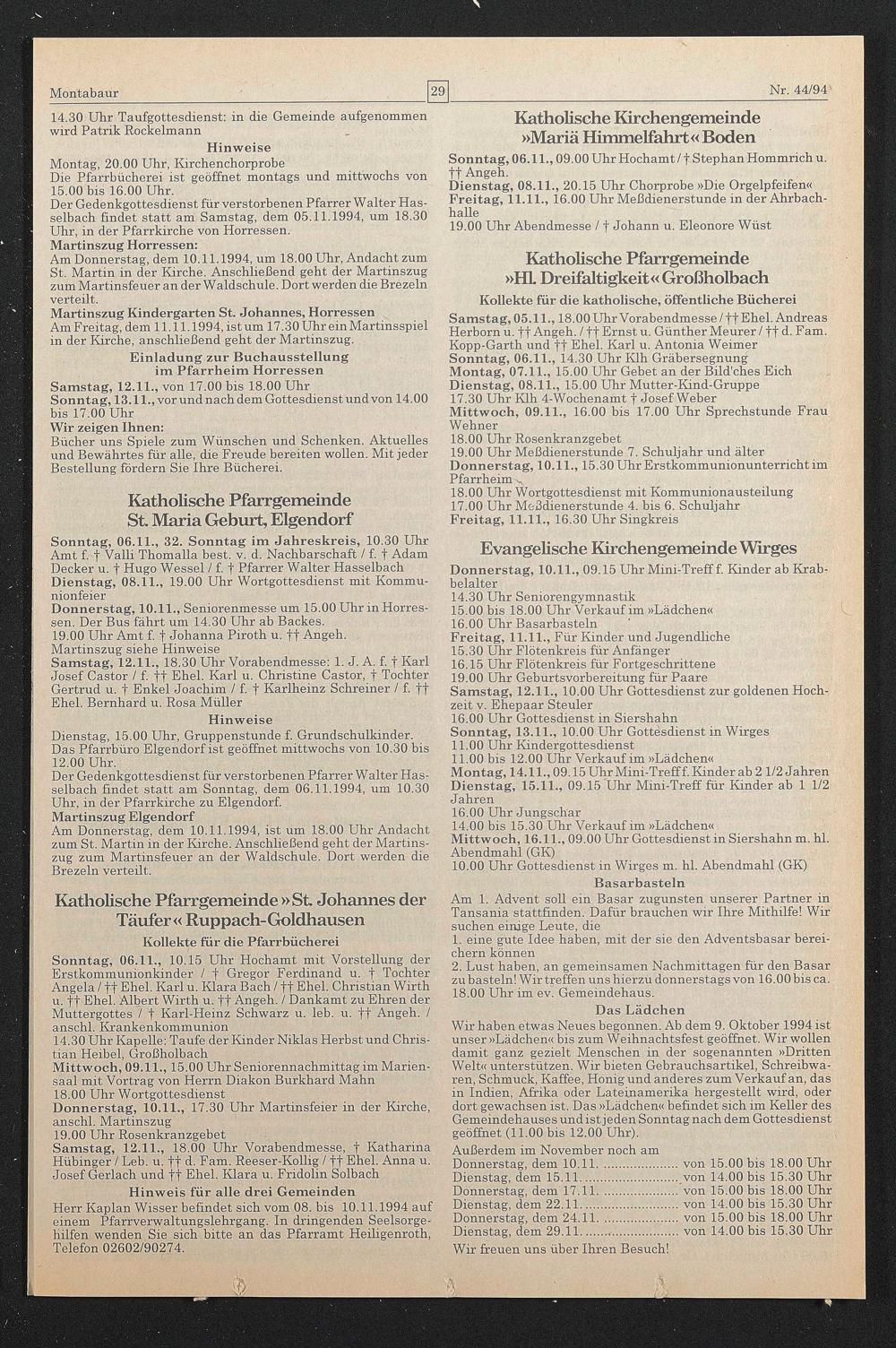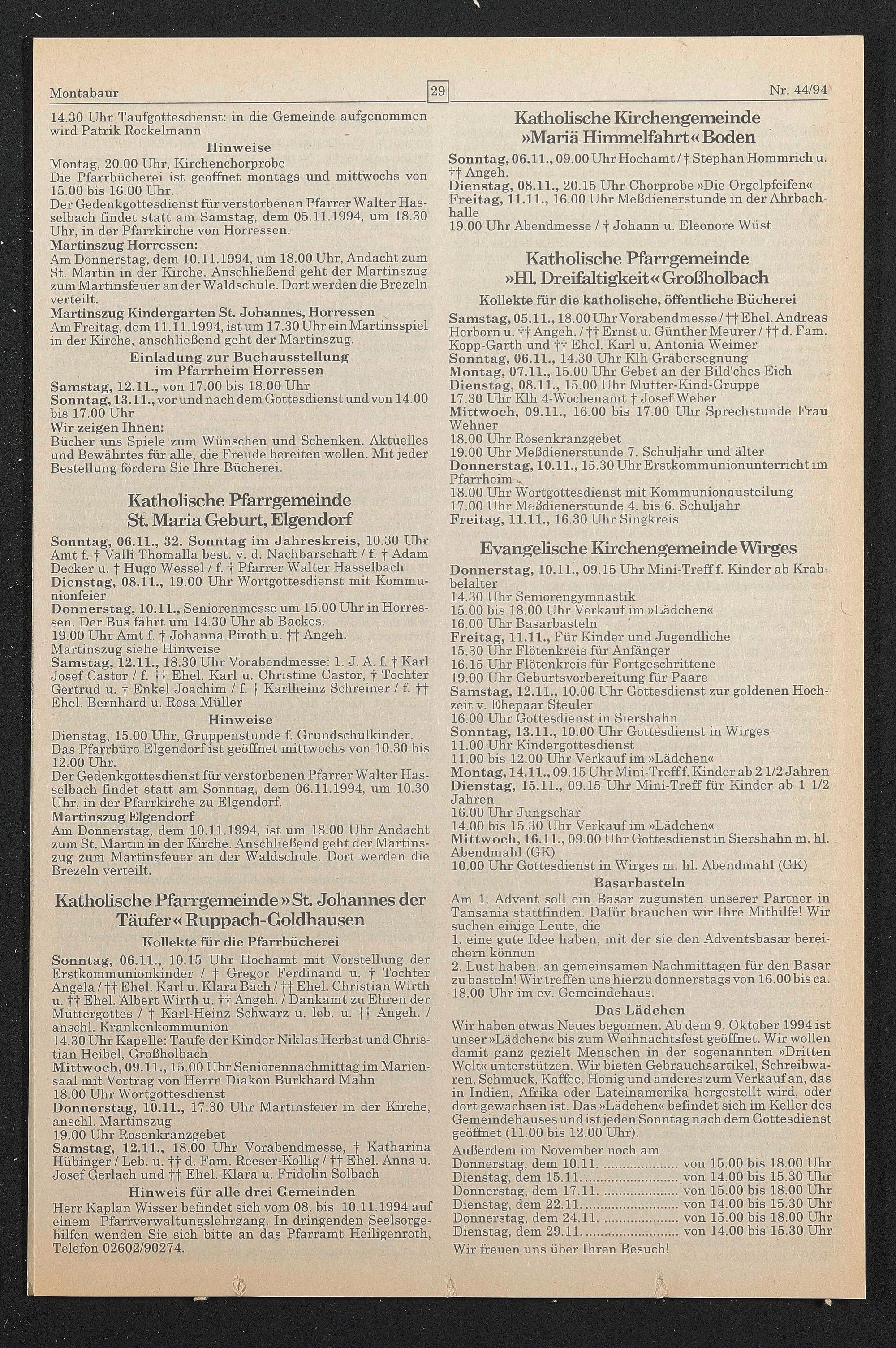 Hinweis für alle drei Gemeinden Herr Kaplan Wisser befindet sich vom 08. bis 10.11.1994 auf einem Pfarrverwaltungslehrgang. In dringenden Seelsorgehilfen wenden Sie sich bitte an das Pfarramt Heiligenroth, Telefon 02602/90274.