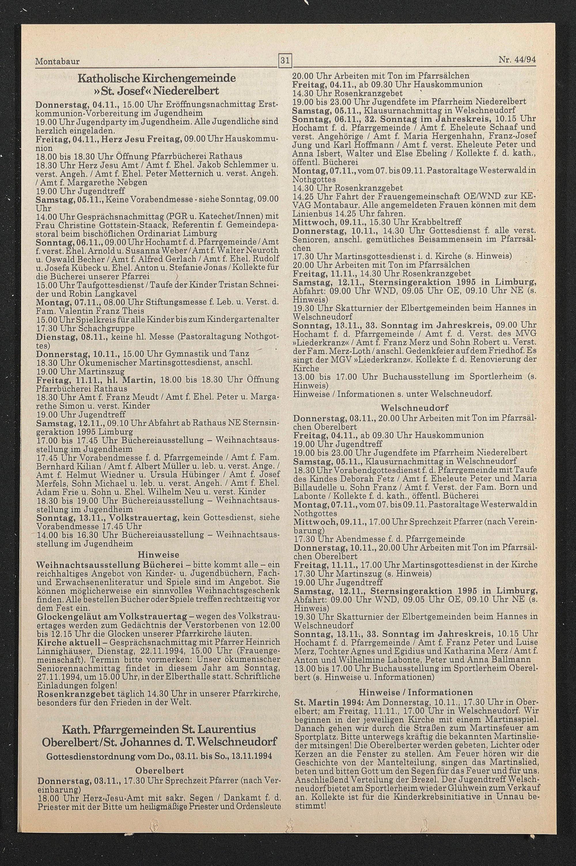 St. Martin 1994: Am Donnerstag, 10.11., 17.30 Uhr in Oberelbert; am Freitag, 11.11., 17.00 Uhr in Welschneudorf. Wir beginnen in der jeweiligen Kirche mit einem Martinsspiel. Danach gehen wir durch die Straßen zum Martinsfeuer am Sportplatz. Bitte unterwegs kräftig die bekannten Martinslieder mitsingen! Die Oberelberter werden gebeten, Lichter oder Kerzen an die Fenster zu stellen. Am Feuer hören wir die Geschichte von der Mantelteilung, singen das Martinslied, beten und bitten Gott um den Segen für das Feuer und für uns, Anschließend Verteilung der Brezel. Der Jugendtreff Welschneudorf bietet am Sportlerheim wieder Glühwein zum Verkauf an. Kollekte ist für die Kiiiderkrebsinitiative in Unnau bestimmt!