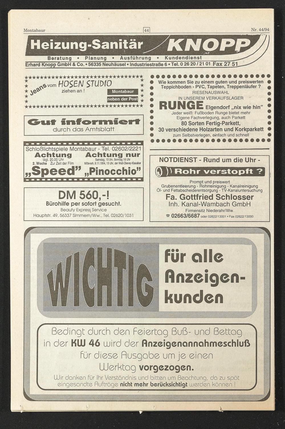 2. Woche Zur Zeit der Film Mittwoch, 9.11.1994,15 Uhr, der Walt-Dlsney-Klassllcer