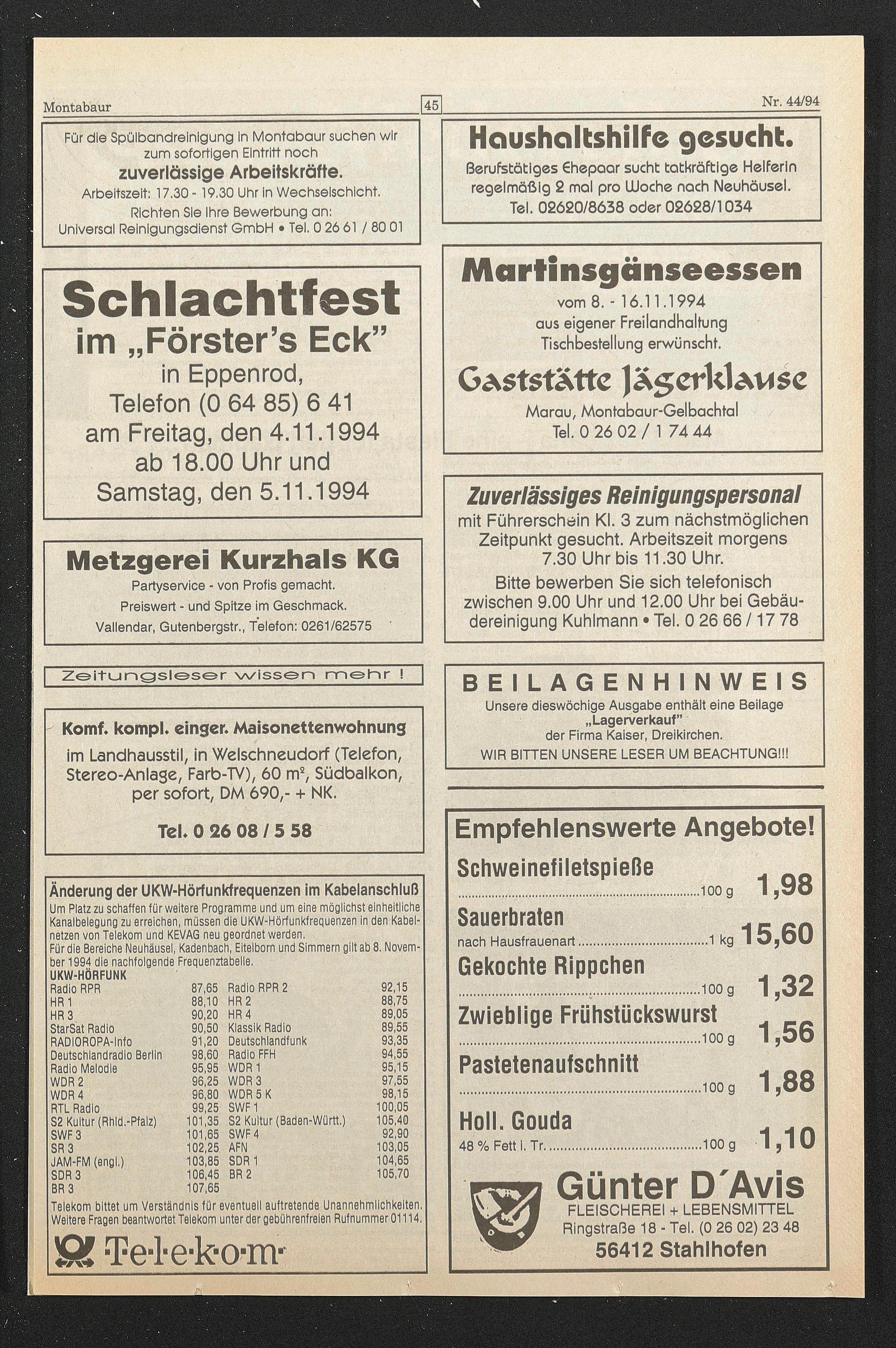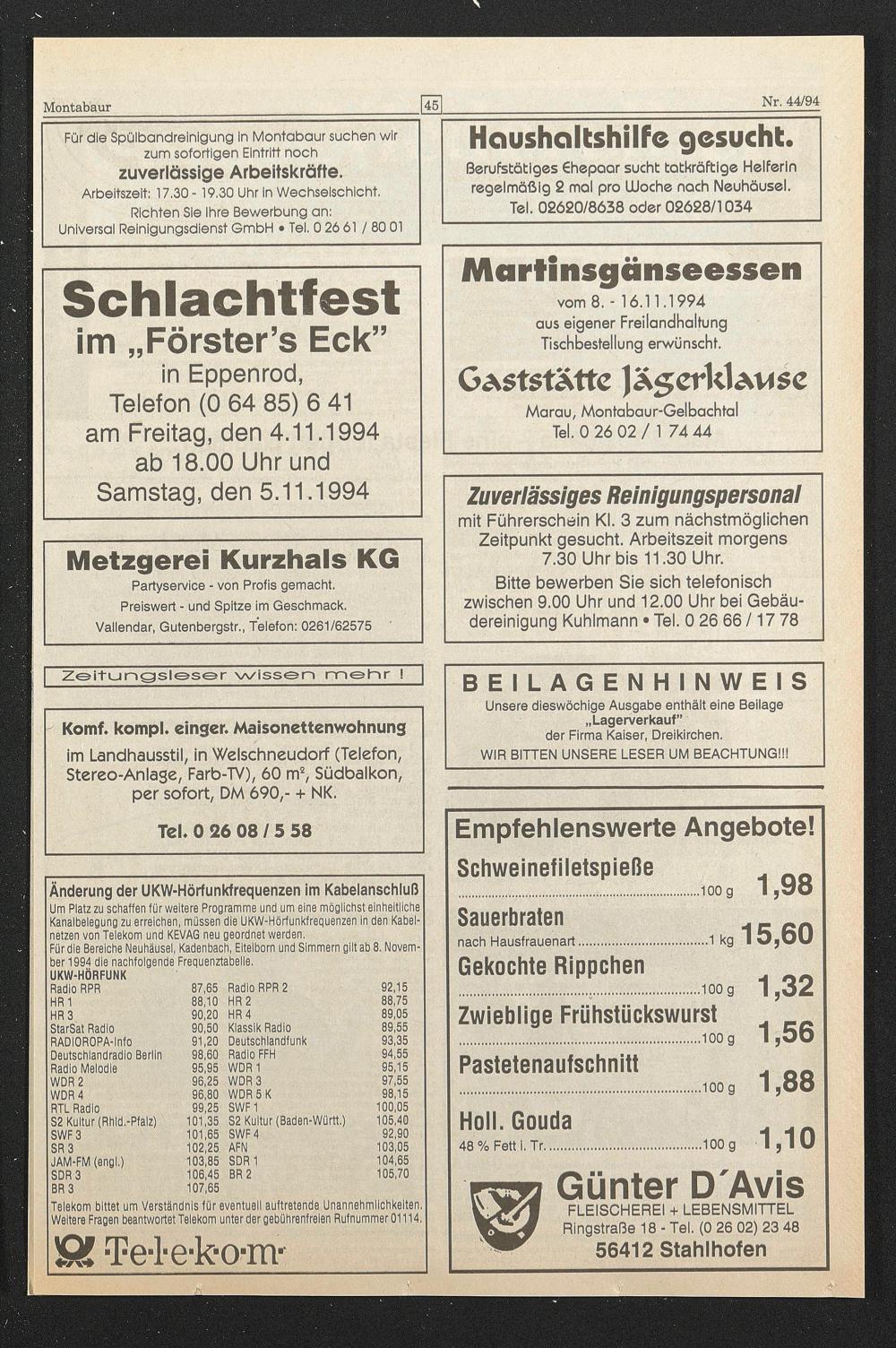 Für die Bereiche Neuhäusel, Kadenbach, Eitelborn und Slmmern gilt ab 8. November 1994 die nachfolgende Frequenztabelle.