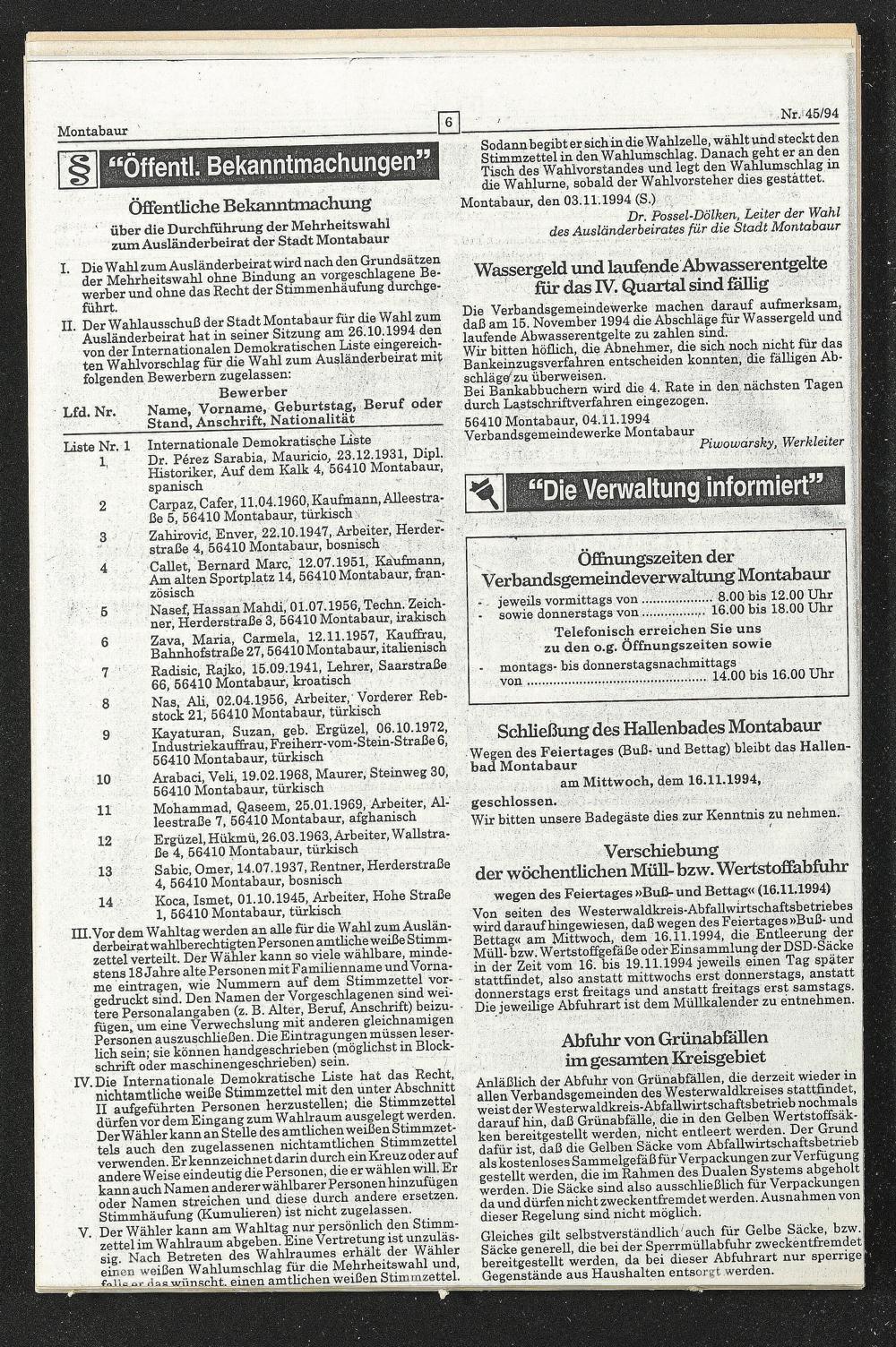 II. Der Wahlausschuß der Stadt Montabaur für die Wahl zum Ausländerbeirat hat in seiner Sitzung am 26.10.1994 den von der Internationalen Demokratischen Liste eingereichten Wahlvorschlag für die Wahl zum Ausländerb errat mit folgenden Bewerbern zugelassen: